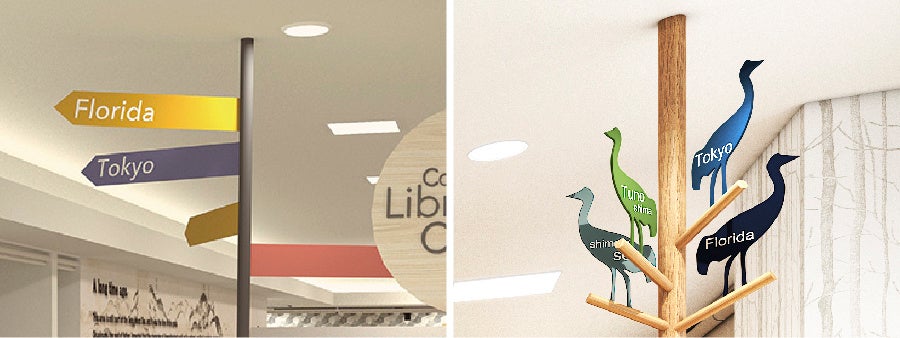 カフェのデザインには、そのホテルが位置する地域のイメージが落とし込まれています。入口付近にある看板は、コンフォートブランドのルーツであるアメリカの「フロリダ」、日本の首都「東京」、そのホテルの宿泊者がよく訪れるスポットの方向を示しており、旅のワクワク感を演出します。