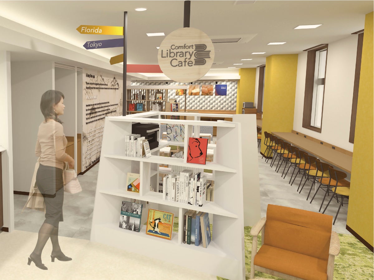 Comfort Library Cafe(以下、カフェ)は、コンフォートホテルのブランドコンセプト「Color your Journey. 旅に、実りを。」にこめた想いをあらわした、自分らしく自由きままに過ごせるスペースです。宿泊者は無料で利用することができ、客室以外で過ごせる場所として、2021年12月現在、29ヶ所のコンフォートホテルに併設されています。ライブラリーをうたっているとおり、プロのブックディレクターがセレクトした、ホテルのある地域に合わせた本を100冊以上取り揃えています。また、無料で飲めるコーヒーや紅茶を用意し、思い思いの時間を過ごせる空間を意識しています。