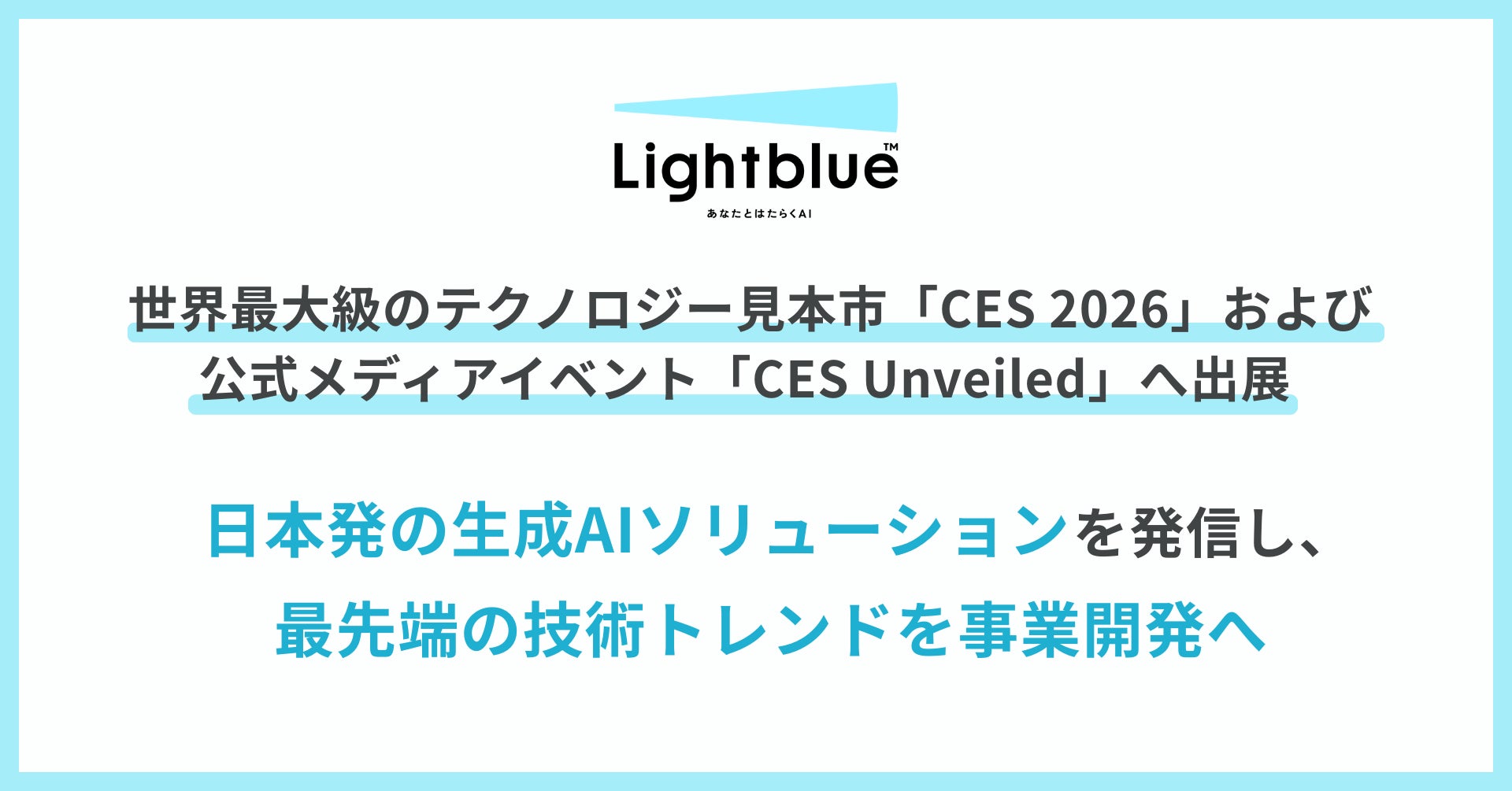 AIアシスタント「Lightblue」を提供する東京大学発スタートアップの株式会社Lightblue(本社:東京都千代田区、代表取締役:園田 亜斗夢)は、2026年1月に米国ラスベガスで開催される世界最大級のテクノロジー見本市「CES 2026」、および開催に先立って行われる公式メディアイベント「CES Unveiled」に出展することをお知らせいたします。