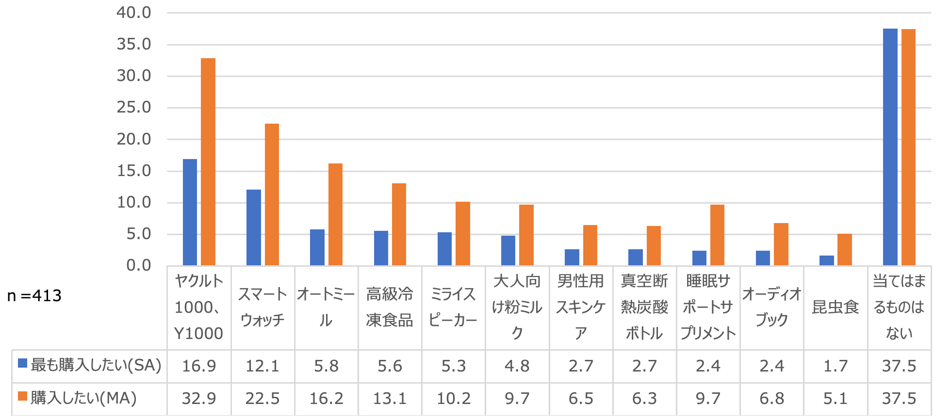 本ホワイトペーパーでは、ラインナップの11商品・ジャンルのうち、今後最も購入したいものを一つ選んでもらったところ「ヤクルト1000、Y1000」が16.9%と一番高い結果となりました。次いで高かったのが「スマートウォッチ」で12.1%でした。これについて「健康管理ができそう」「多機能で良さそう」「既に使っていて新しいものに買い替えたい」という声が寄せられていました。