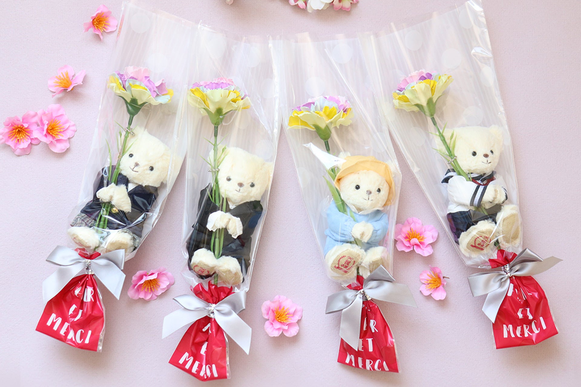 小さなテディベアが一輪の花を持っている姿は、とても可愛くてフォトジェニック。 卒業式後の写真撮影にもぴったりです。