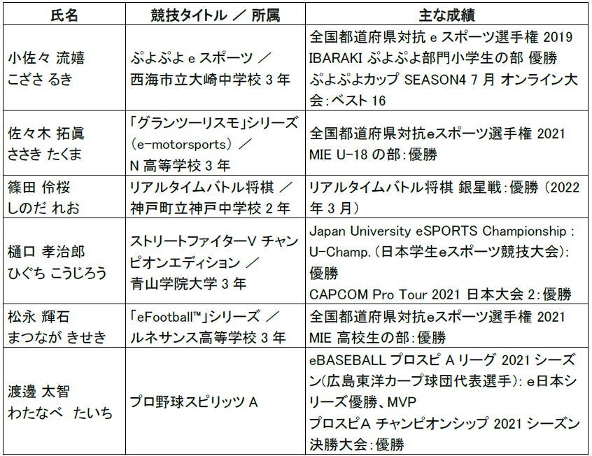 eスポーツ選手が「スポーツ選手支援事業」の対象として選定されるのは、昨年に引き続き2年連続となります。今回新たに支援対象に選定された選手は、JeSUライセンス公認タイトルの公式大会などで優秀な成績を収めた6名です。