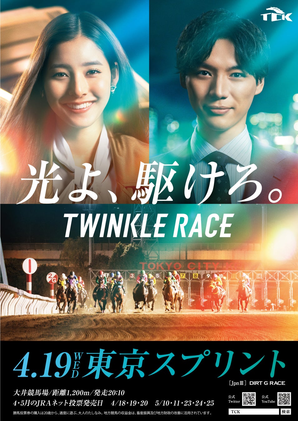 4月19日(水)東京スプリント(JpnⅢ)の実施を記念して、2023年度TCKイメージキャラクターの新木優子さん、福士蒼汰さんのオリジナルポスターを抽選で10名様にプレゼントするTwitterキャンペーンを実施します。TCK公式アカウント「@tck_keiba」をフォローのうえ、キャンペーン投稿をリツイートするだけで応募完了!たくさんのご応募、お待ちしております!