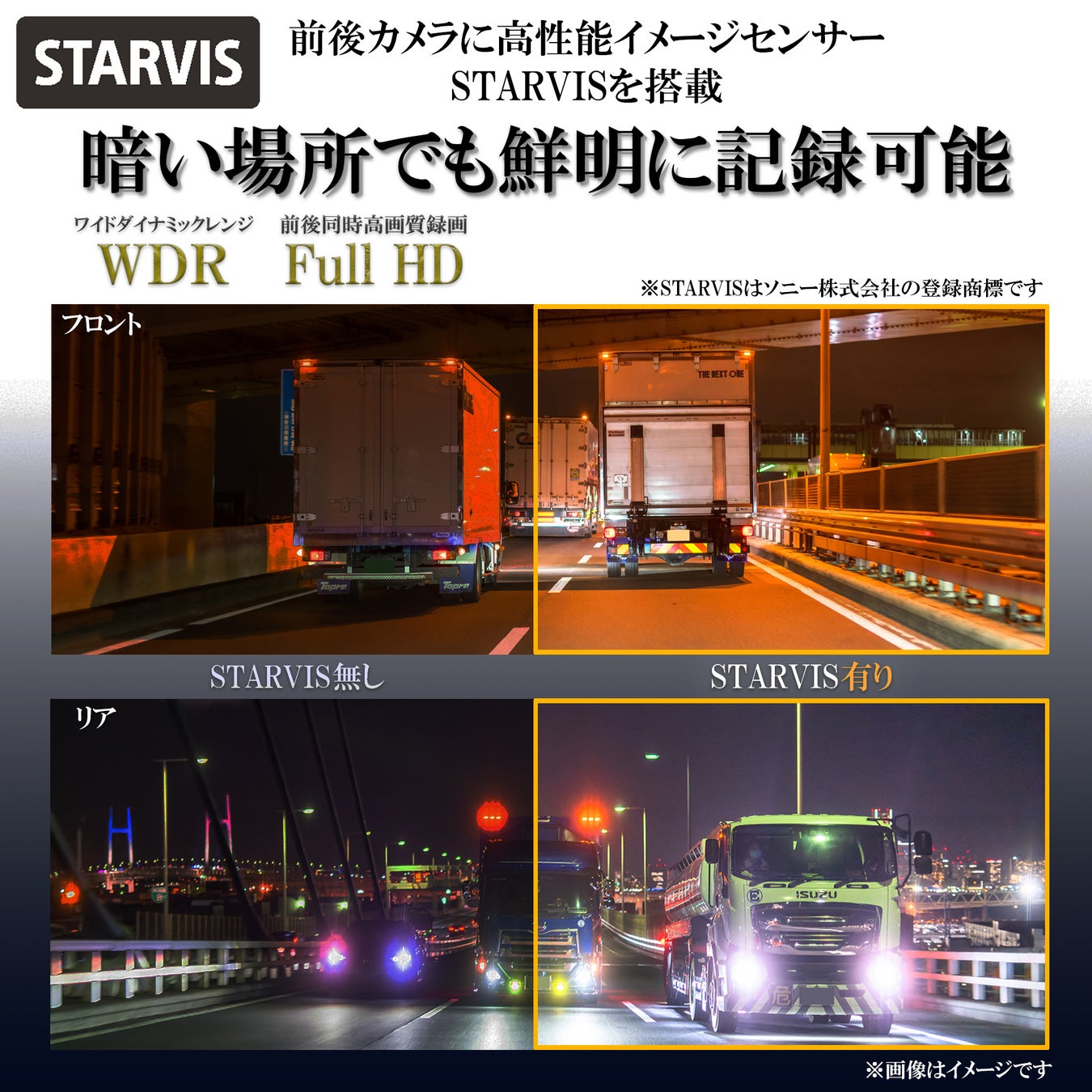夜間に強い高性能イメージセンサー「STARVIS」を搭載。WDR機能と合わせ夜間や悪天候でも前方後方共に視界を広くはっきり映し出し、フルハイビジョン解像度の高画質録画で高い視認性を確保できます。