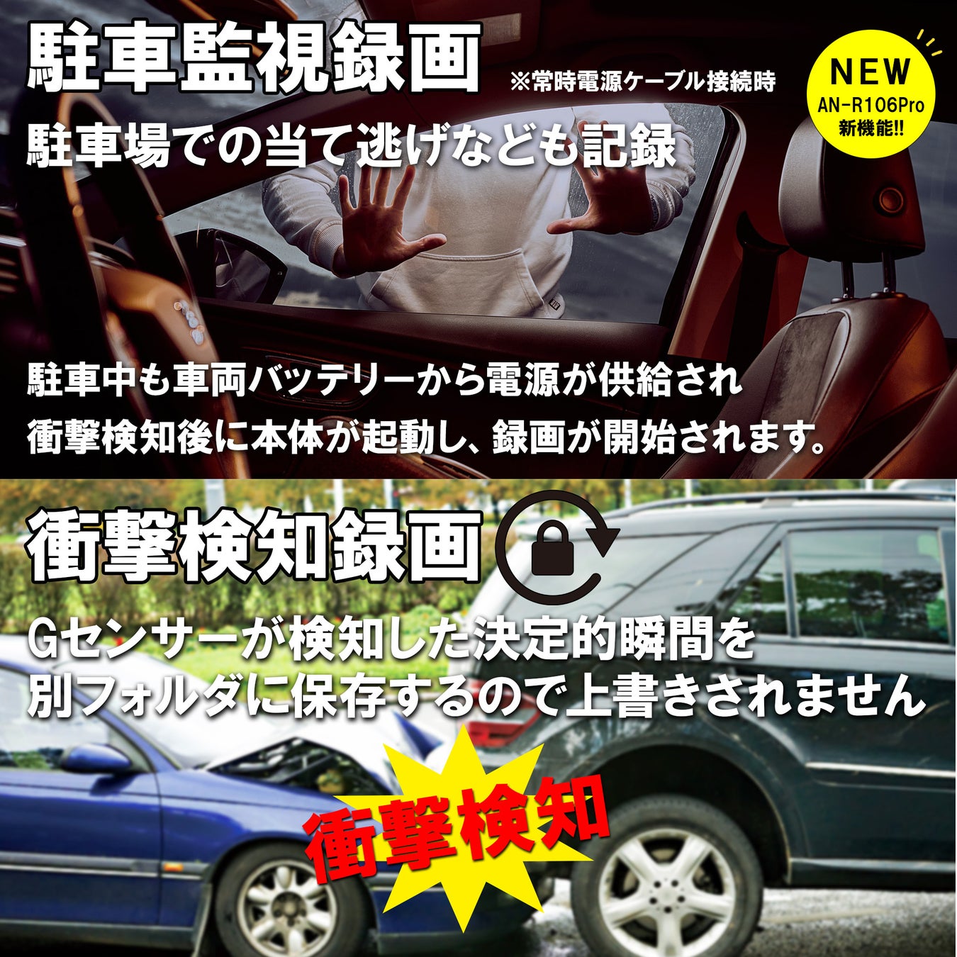 車のエンジンOFF状態でGセンサーによる衝撃検知監視を行います。当て逃げや車上荒らしなど駐車中のトラブルを衝撃を検知後に録画致します。