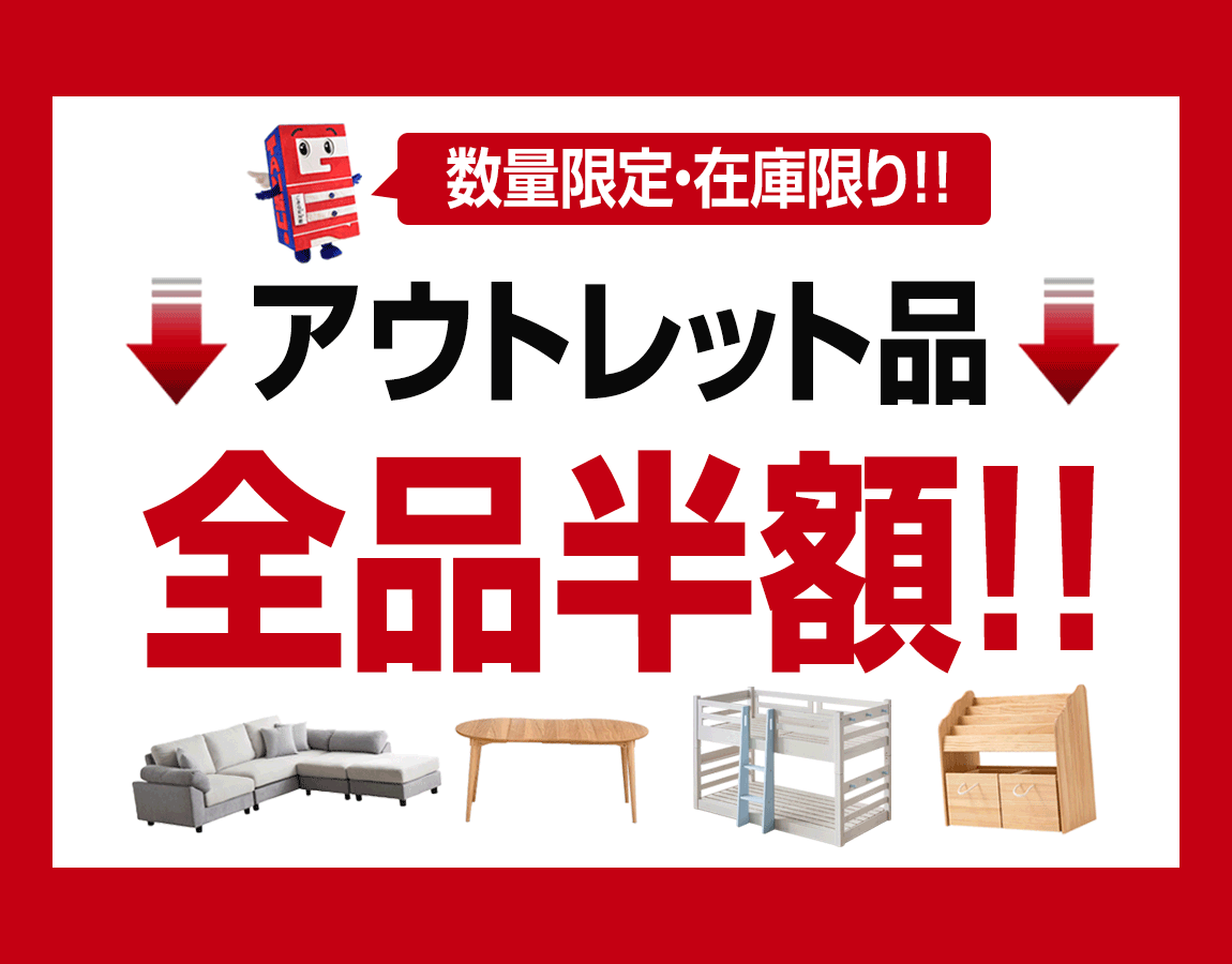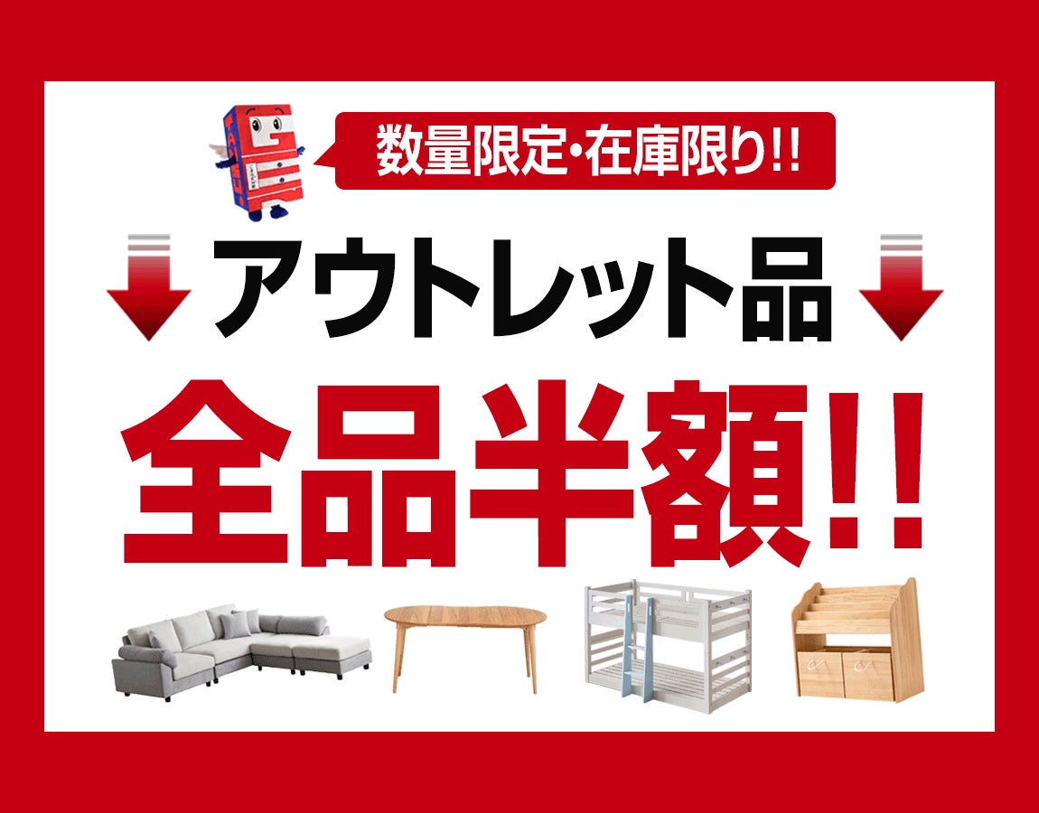 なお、今回、タンスのゲンの定番人気の「カルロ」シリーズのソファセットや新商品の伸長式のダイニングテーブル、お子様向けの絵本ラックや二段ベッドなど、様々な人気商品のアウトレット品が定価の50%オフで出品予定です。