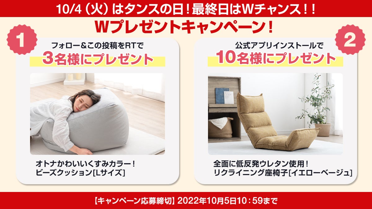 10月4日(火)の「タンスの日」には、Twitter上のキャンペーン以外にも、「タンスのゲン本店アプリ」をインストールされているお客様を対象に、低反発リクライニング座椅子が10名様に当たるWキャンペーンを実施いたします。詳細については、タンスのゲン公式Twitterをご参照ください。