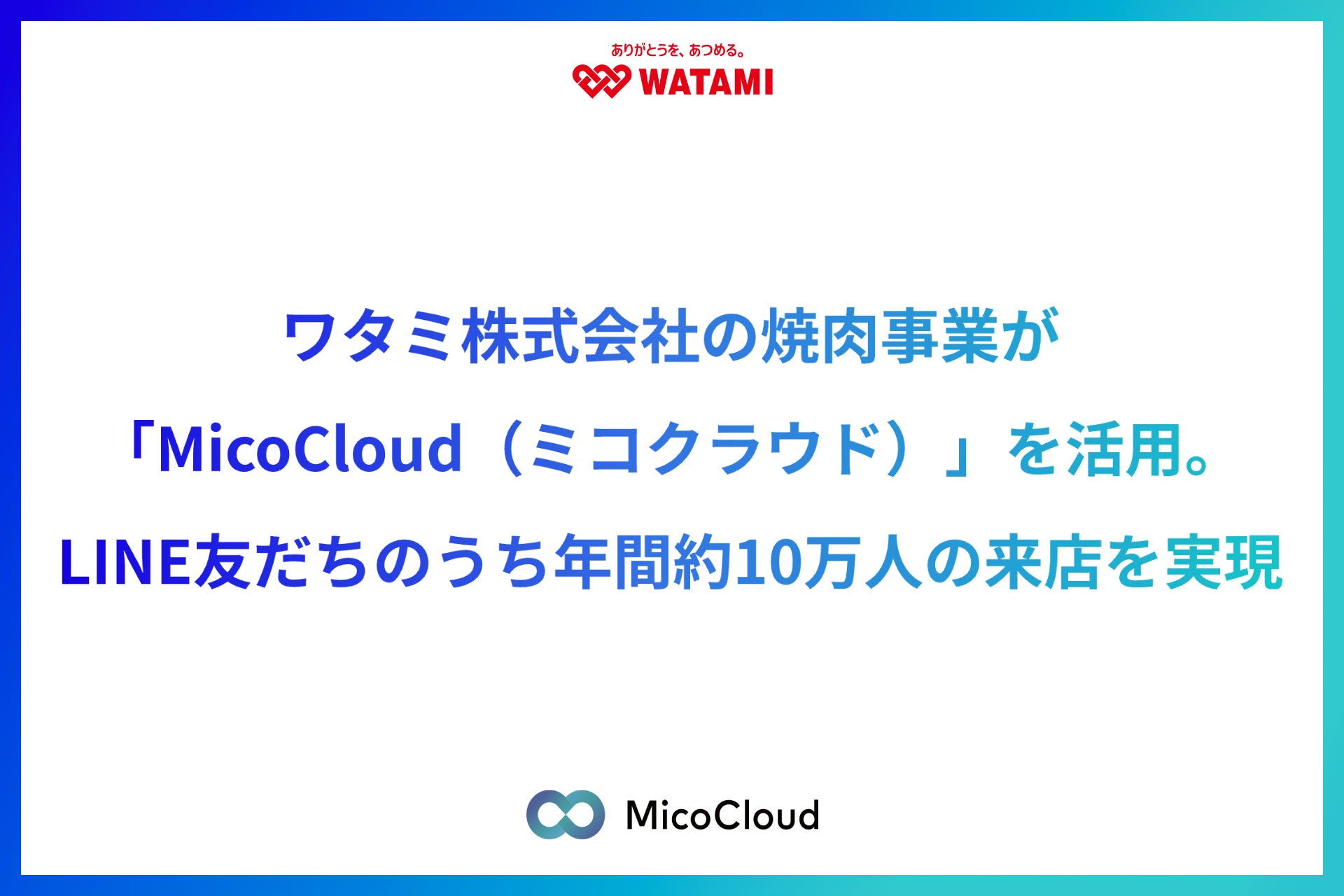 Micoworks株式会社(本社:大阪市北区、代表取締役社長:山田 修)は、国内外食大手のワタミ株式会社(本社:東京都大田区、代表取締役会長兼社長 CEO:渡邉 美樹)の「焼肉の和民」、「かみむら牧場」でLINEを活用したマーケティングプラットフォーム「MicoCloud(ミコクラウド)」を活用し、LINE公式アカウント友だちのうち、年間約10万人が来店しており、集客基盤の構築に成功したことを発表いたします。