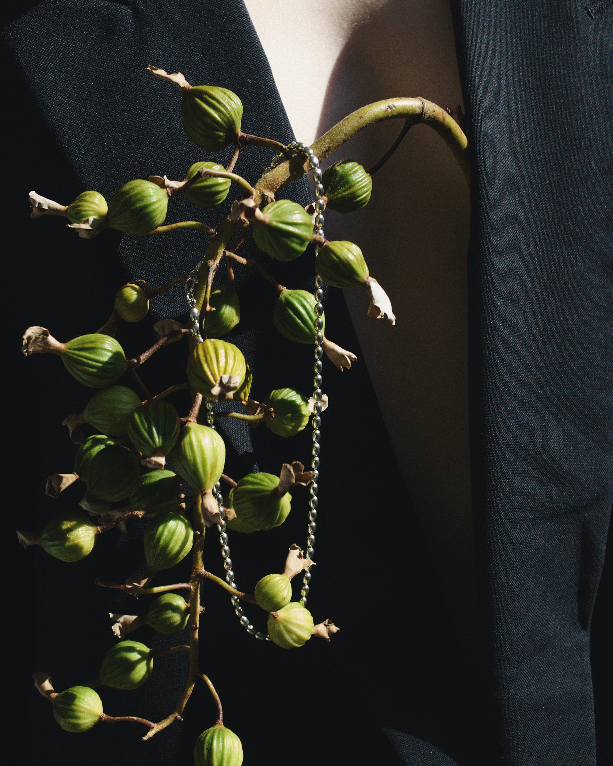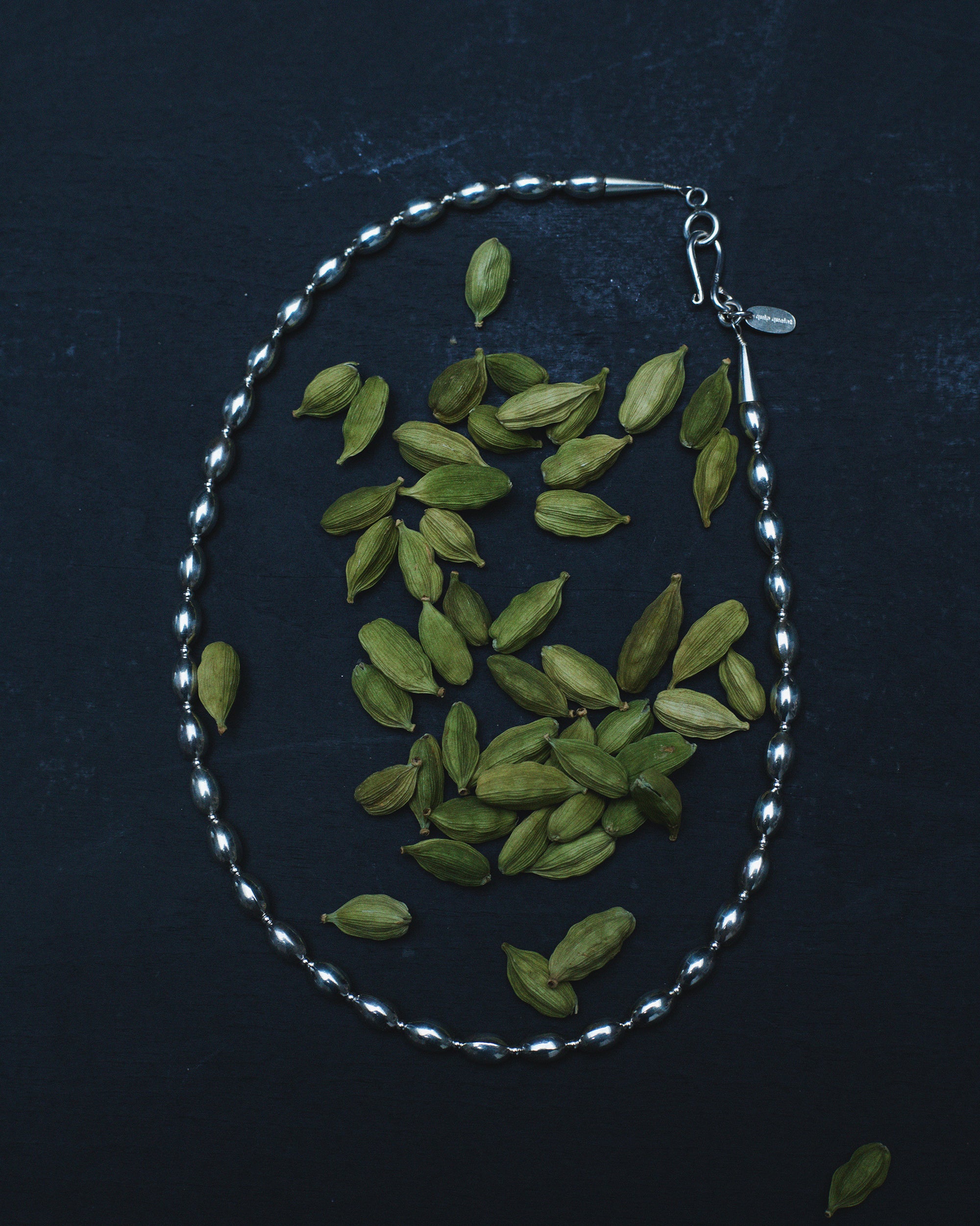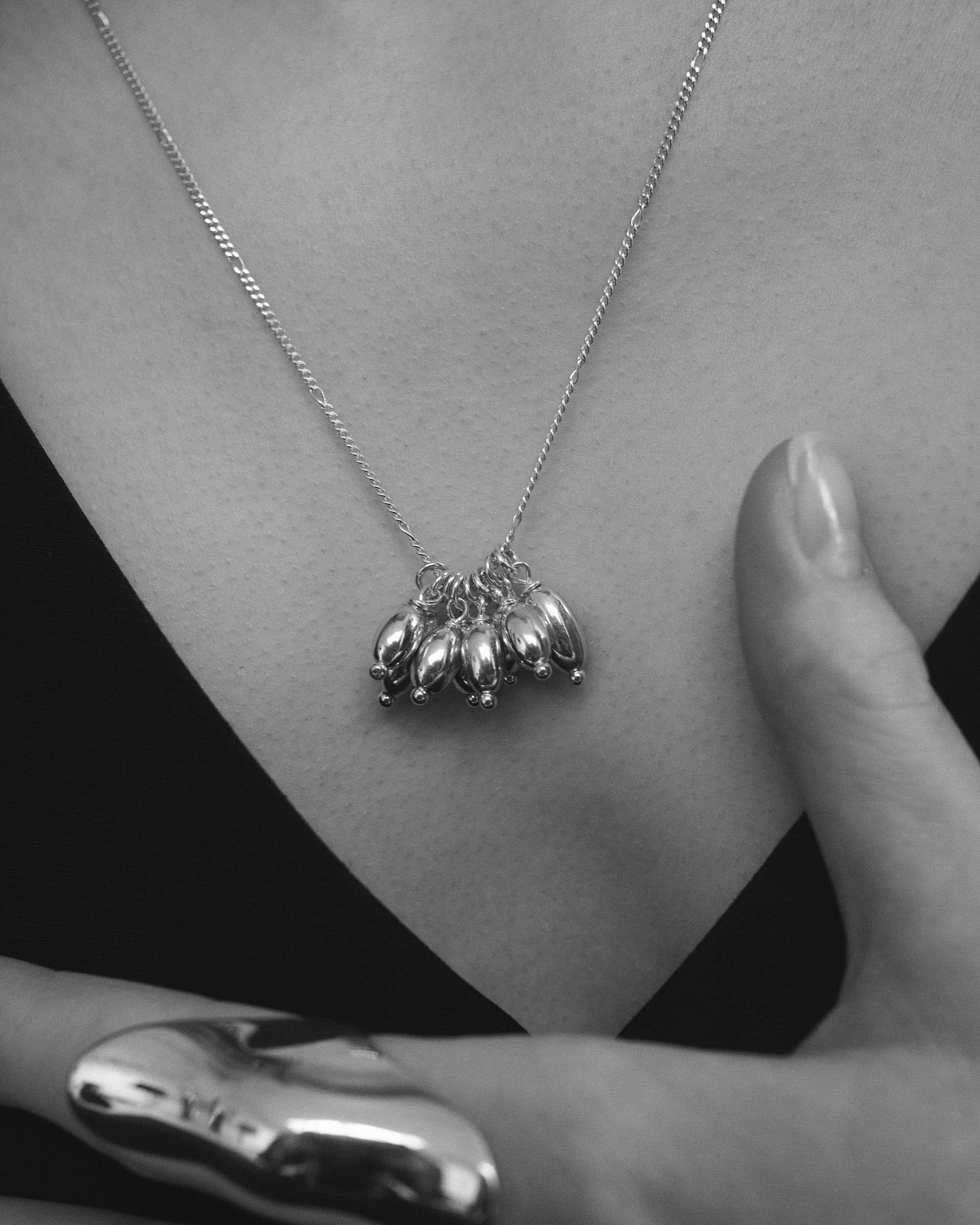 種をイメージした有機的なフォルムが繊細なチェーンの上で軽やかに揺れ、首元にさりげない奥行きとリズムをプラス。