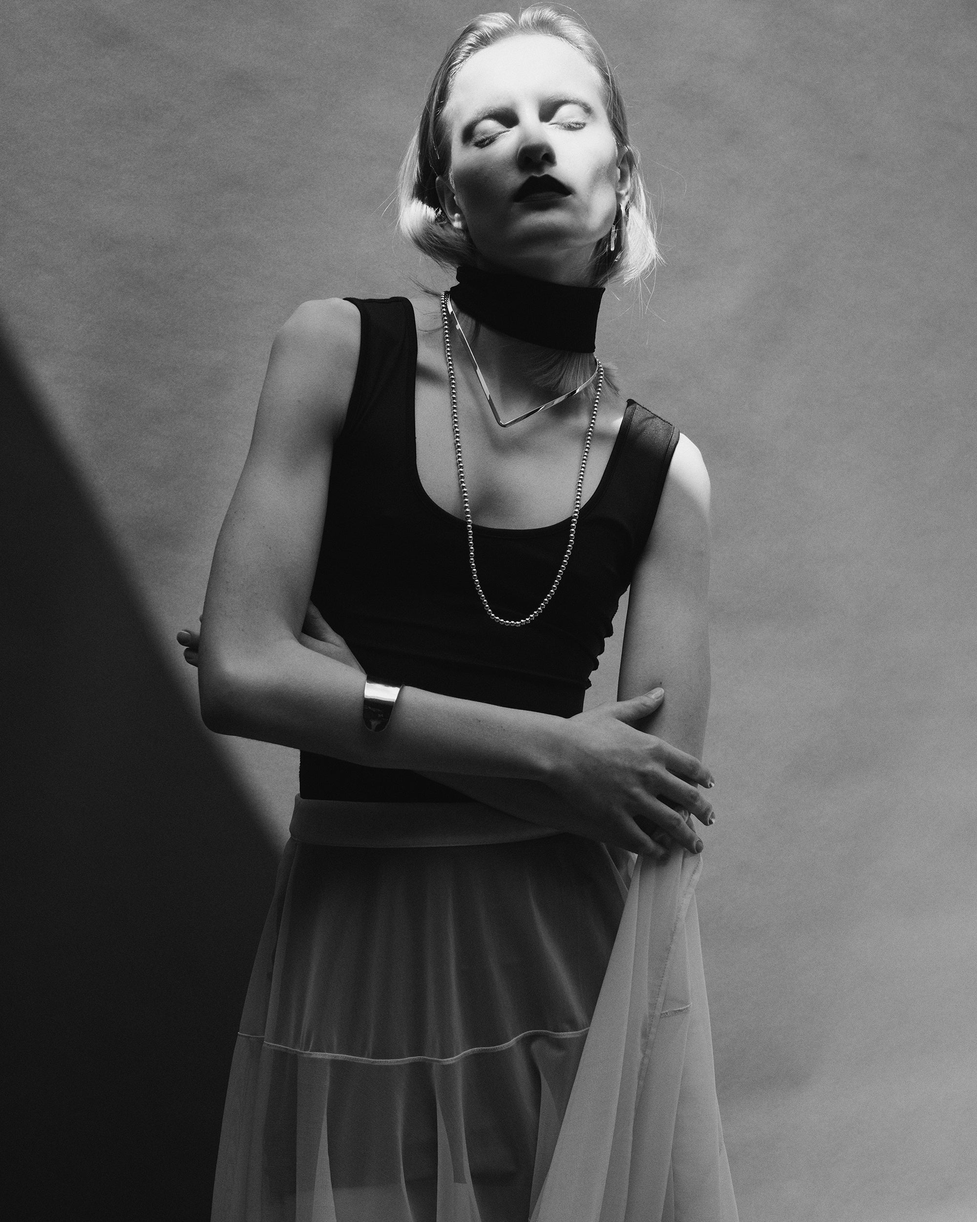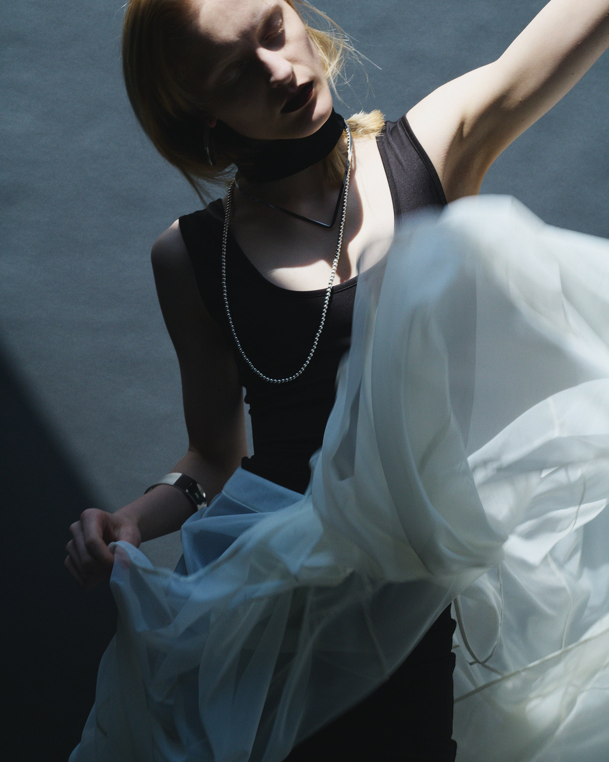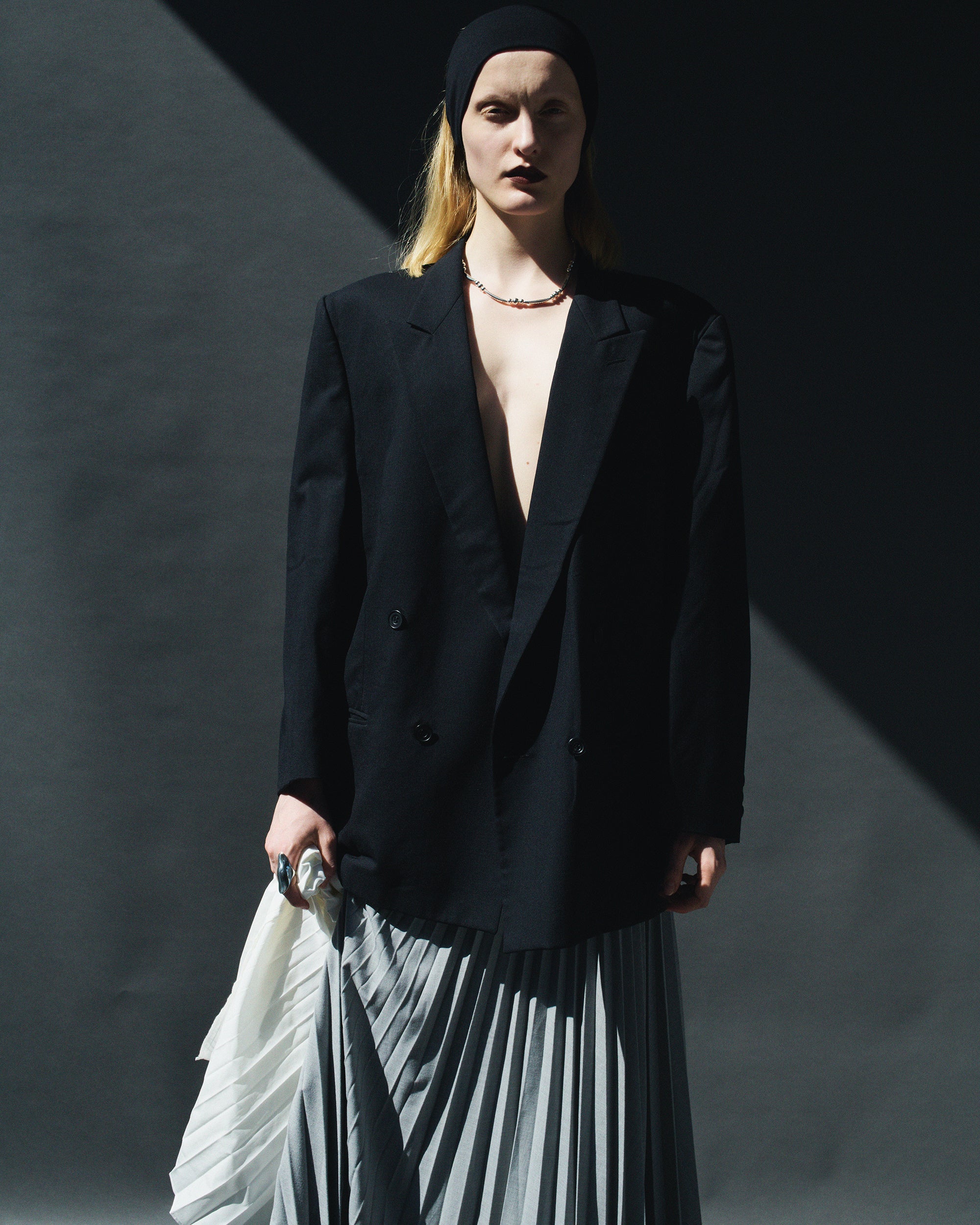 白シャツやタイトなトップスなど余白のある装いには縦のラインが映え、構築的なムードに。