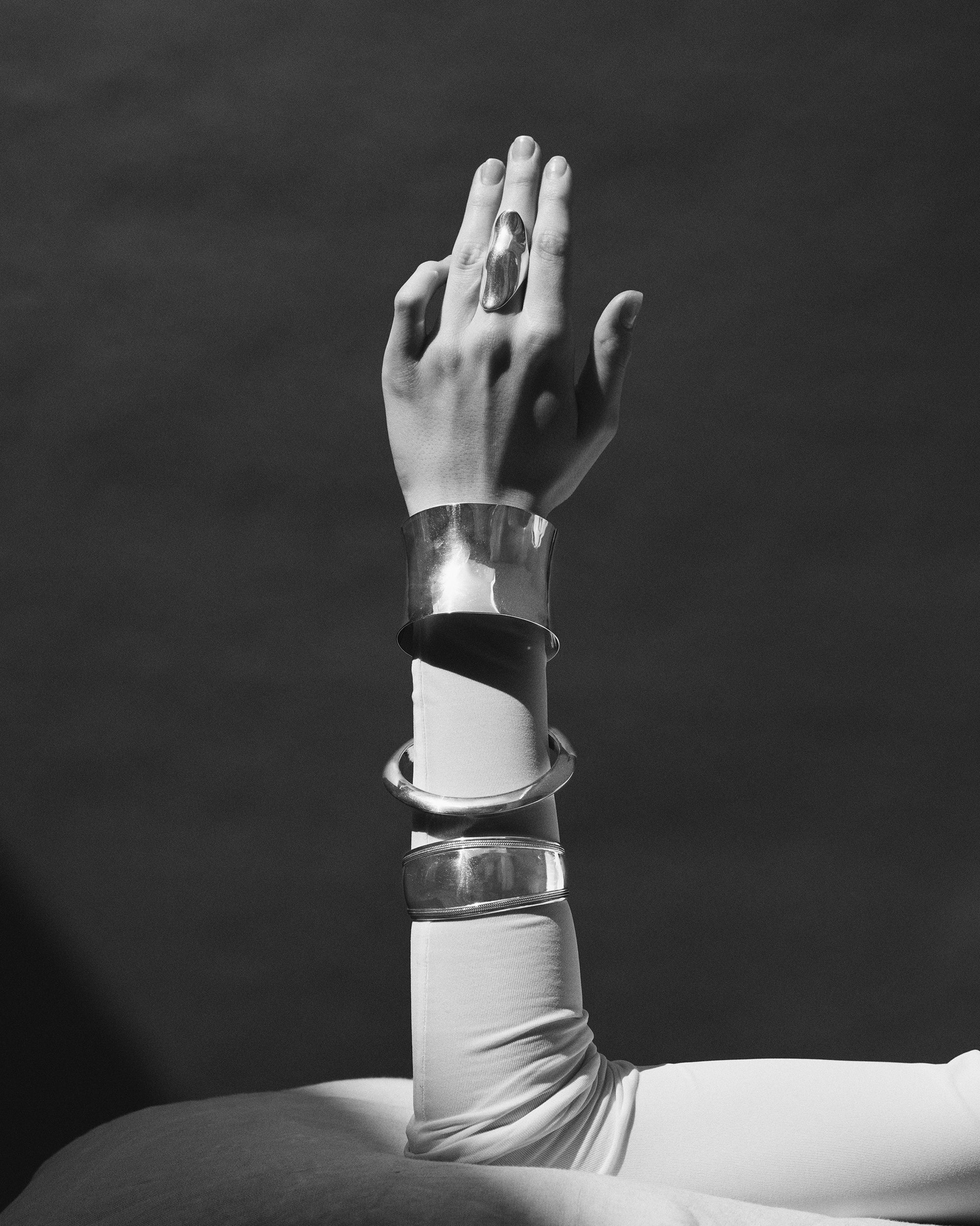 幅を持たせたフォルムが手首を包み込むように沿い、肌と自然に調和するシルエットを描きます。