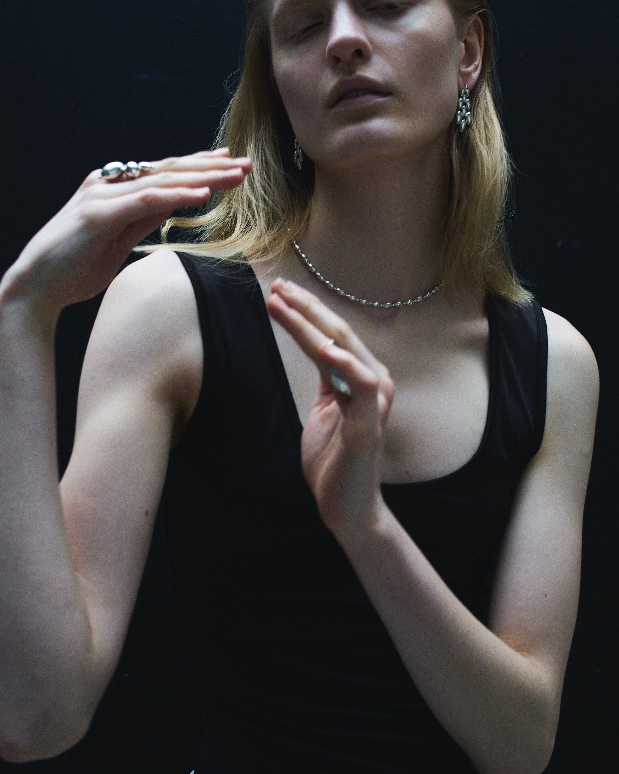 素肌のうえで光を受けて輝きを放つシルバーのテクスチャーが、顔周りをシャープでスタイリッシュにみせてくれます。