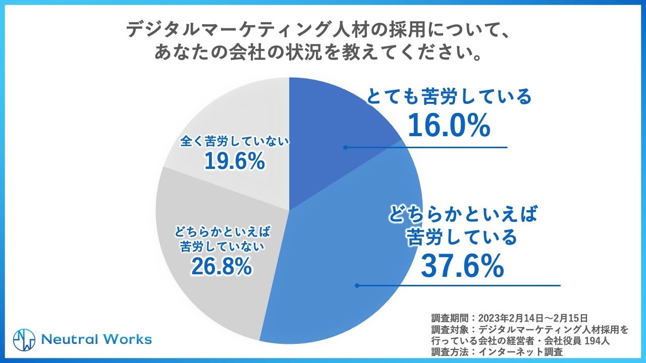 デジタルマーケティングの重要性を感じている企業の割合が高いことが分かりましたが、人材採用の状況については「とても苦労している」が16.0%、「どちらかといえば苦労している」が37.6%と回答。合わせて半数以上(53.6%)が「苦労している」と回答し、思うように採用を進めるには障壁があることがうかがい知れる結果となりました。