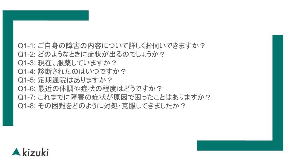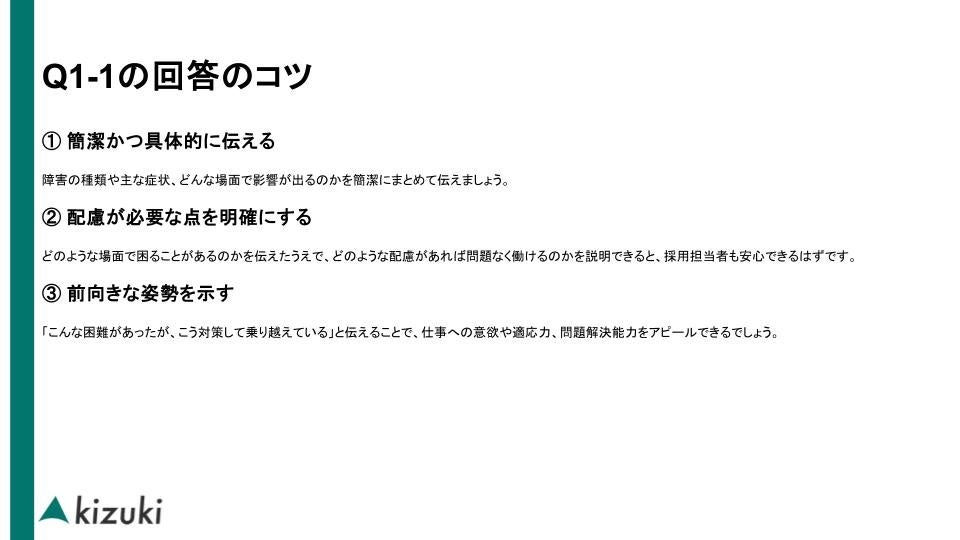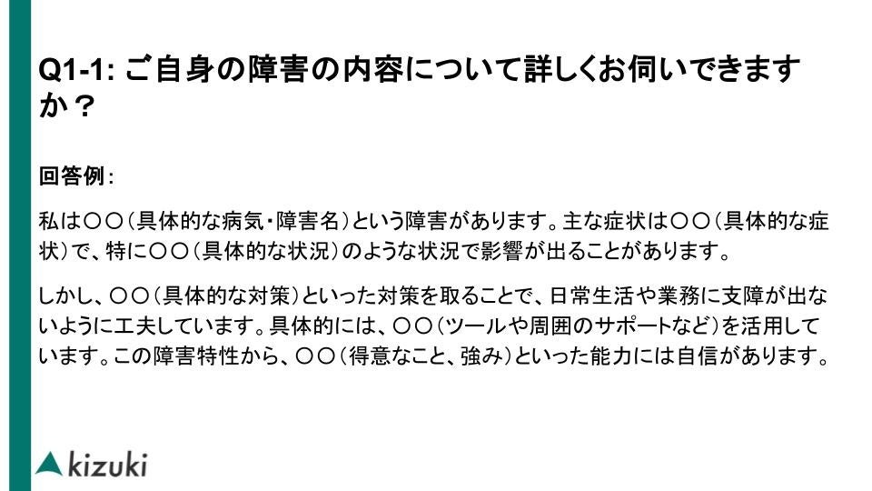 本ガイドブックでは、障害者雇用の面接でよく聞かれる質問40問以上を厳選し、キズキビジネスカレッジ(KBC)の知見をもとに、それぞれの回答例と回答のコツを詳しく解説しています。