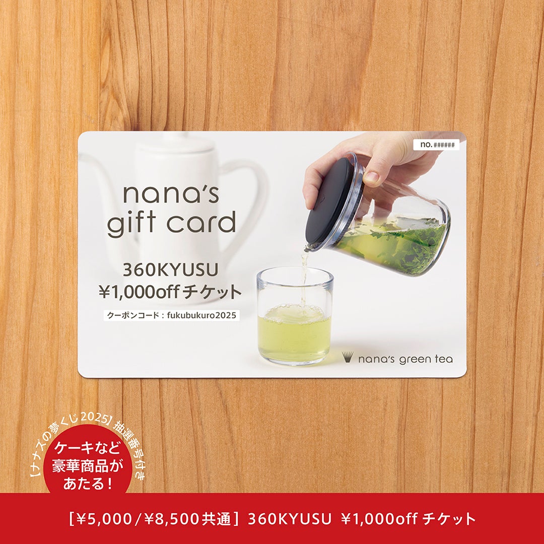 nana's green tea各店舗、公式オンラインストアにて使用できる「360KYUSU」の¥1,000offチケットです。