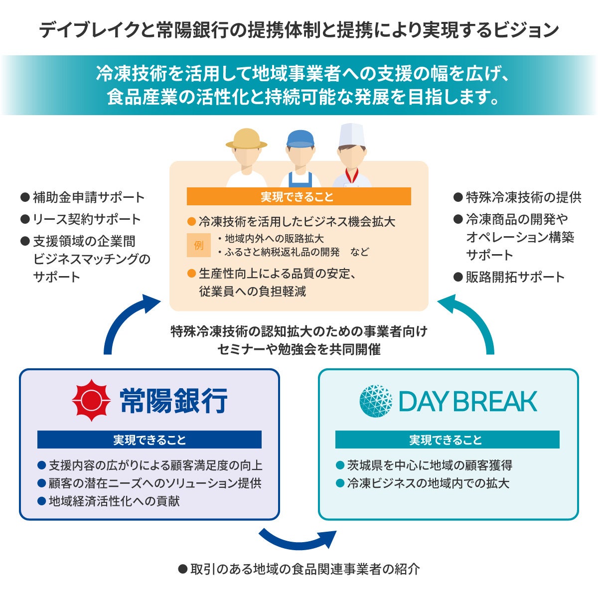 茨城県を中心とした、常陽銀行の主要な営業地盤において特殊冷凍技術の認知拡大および導入・活用支援の取り組みを継続的に実施してまいります。認知拡大に向けた取り組みとして、デイブレイクと常陽銀行が共同でセミナーや勉強会を実施するほか、補助金申請やリース契約のサポートなど、特殊冷凍機の円滑な導入・活用を進めるためのサポートを常陽銀行が行います。