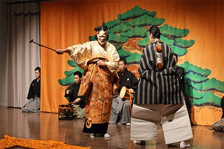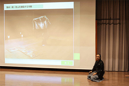 また、講堂「AITADE HALL」では、重要無形文化財総合指定保持者の能楽師・辰巳満次郎氏や人間国宝の小鼓方・大倉源次郎氏をお迎えし、能の基礎知識の解説、能の所作や楽器を体験できるワークショップを行った後に、「葵上」の実演を観賞しました。講堂が能の舞台となり、参加者は楽しい解説や力の込められた実演に見入っていました。