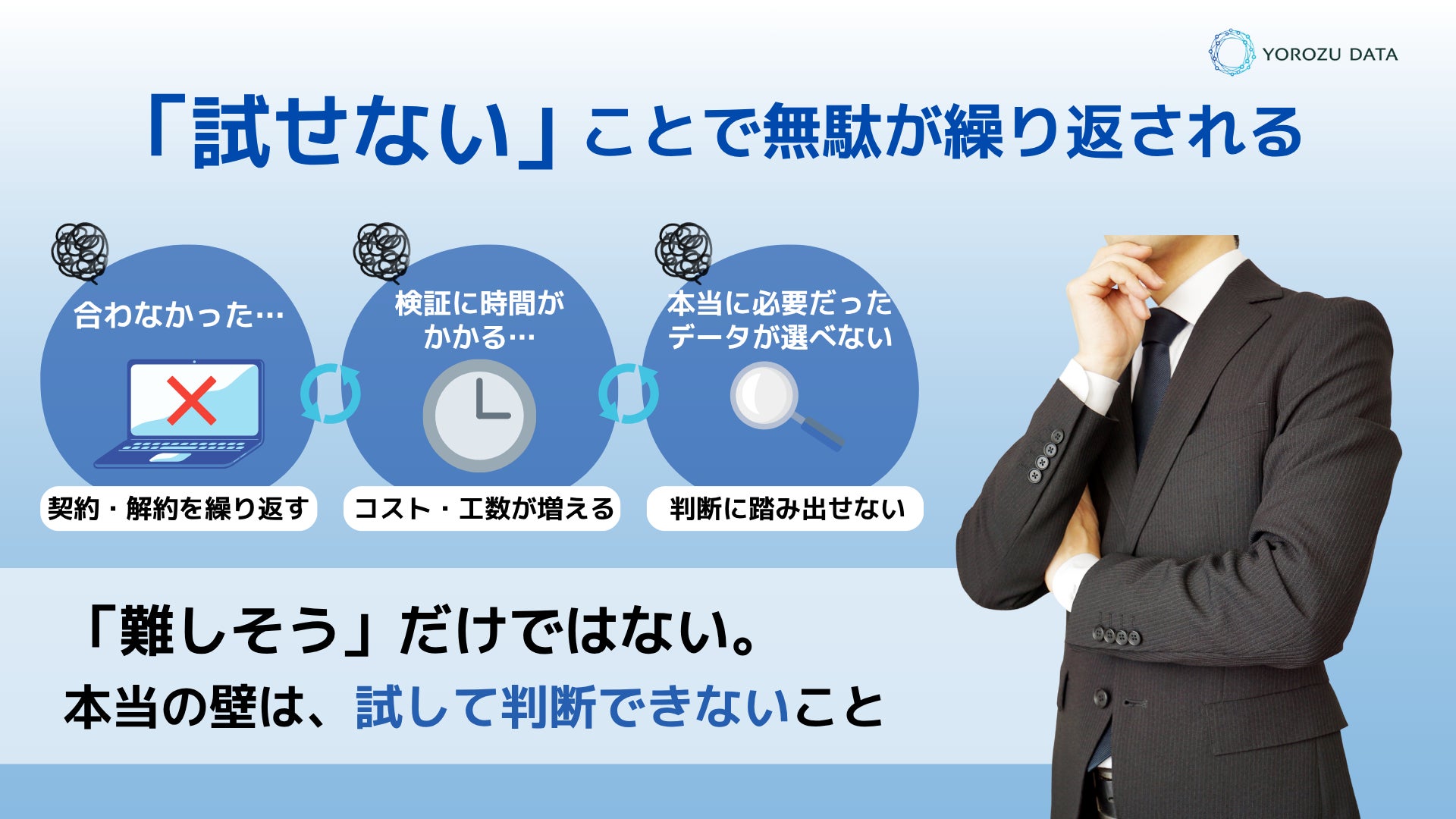 YOROZU DATAは、「試してから判断する」という流れを当たり前にすることで、データ活用をより身近なものにしていきます。