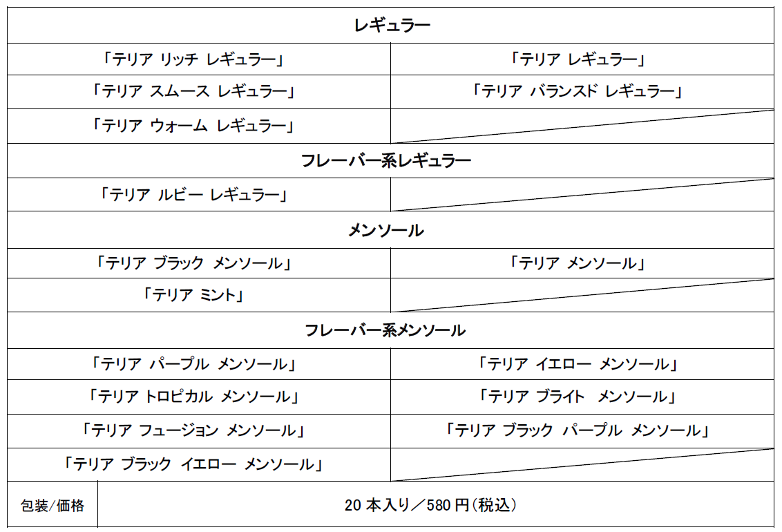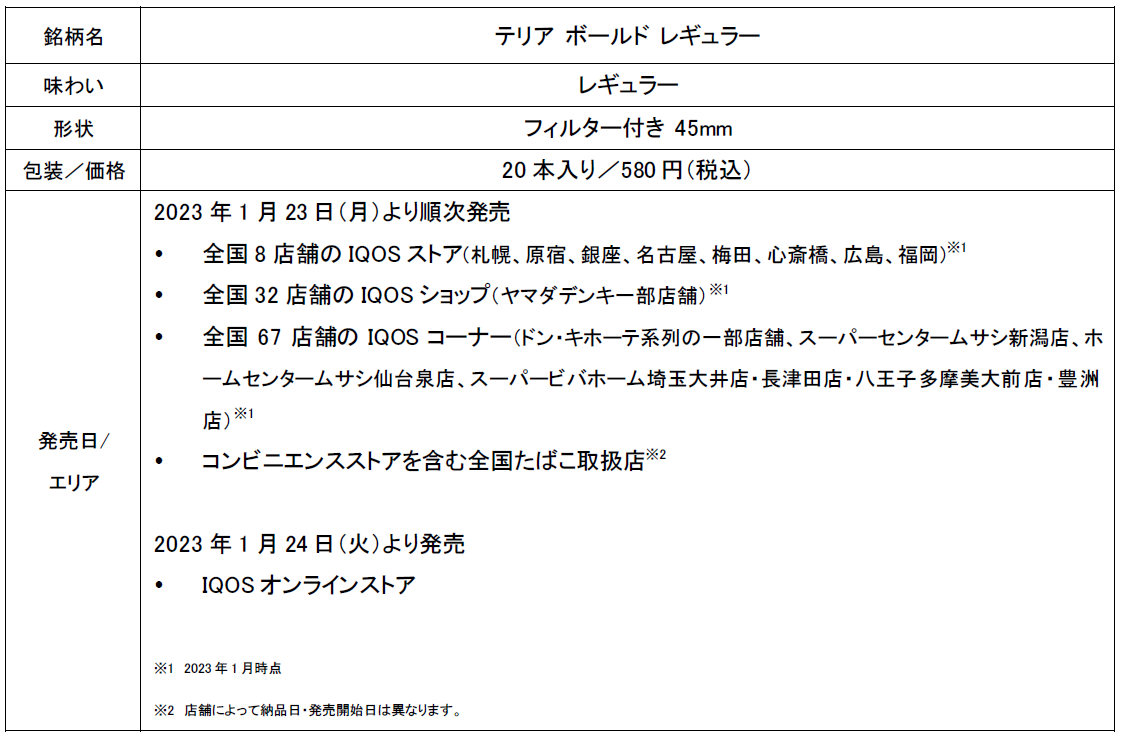フィリップ モリス ジャパン合同会社(本社:東京都千代田区、社長:シェリー・ゴー、以下「PMJ」)は、加熱式たばこIQOS ILUMA(イルマ)専用たばこスティックの「テリア」から、「テリア ボールド レギュラー」を2023年1月23日(月)より、全国8店舗のIQOSストア※、IQOSショップ(ヤマダデンキ一部店舗)、IQOSコーナー(ドン・キホーテ系列一部店舗他)、コンビニエンスストアを含む全国たばこ取扱店で、2023年1月24日(火)より、IQOSオンラインストアにて順次発売いたします。