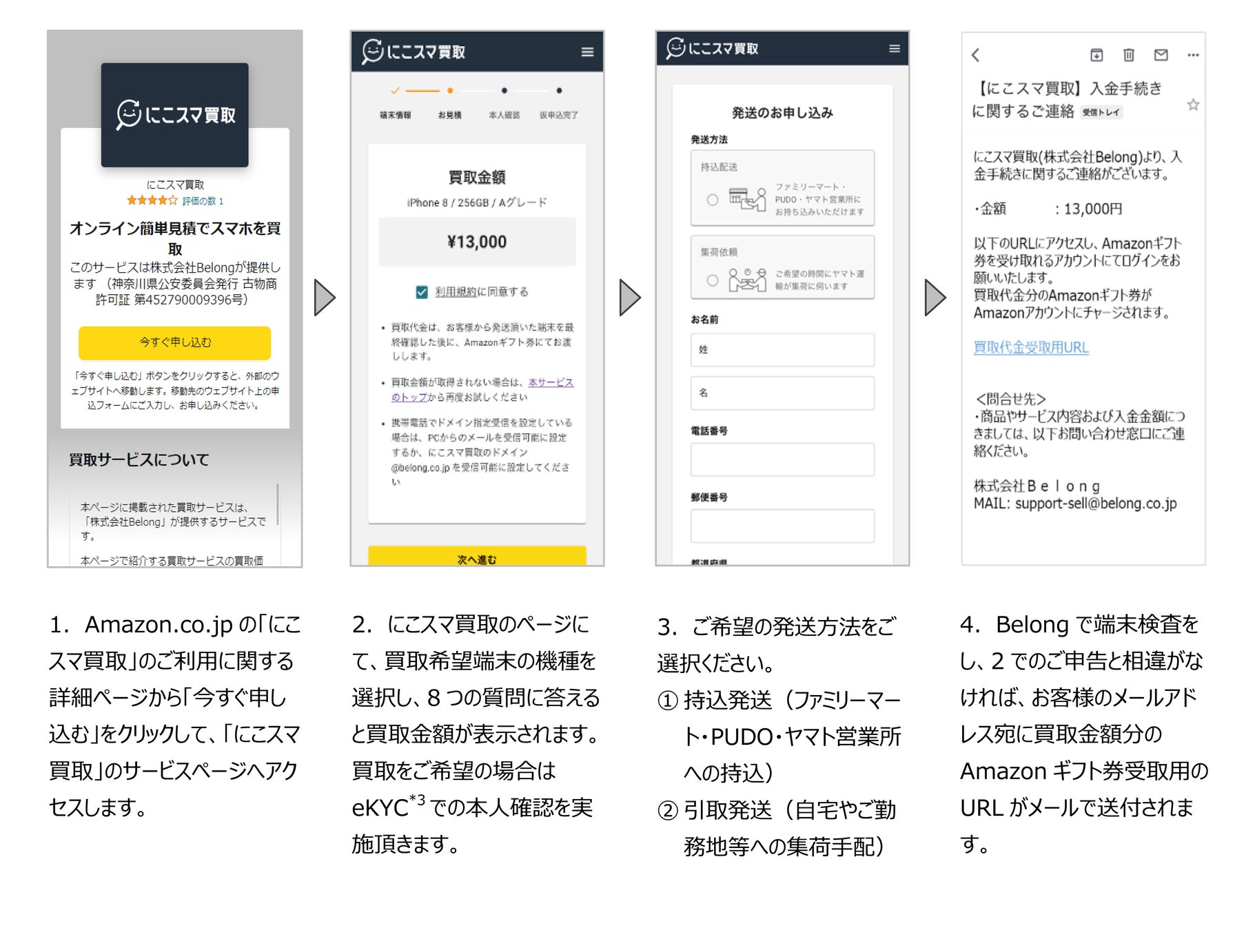 Belongは、創業以来「正直であること」を信条に、すべての人に中古スマートフォンを知っていただき、より身近に感じていただけるよう、サービスを提供してまいりました。その中で「にこスマ買取」はスマートフォンを初めて売却する方でも安心して簡単に売却いただけるサービスを目指して運営をしております。今回、Amazon.co.jpを経由して「にこスマ買取」のサービスを提供することで、新しいスマートフォンの購入時の端末売却がより便利にご利用いただけるようになります。