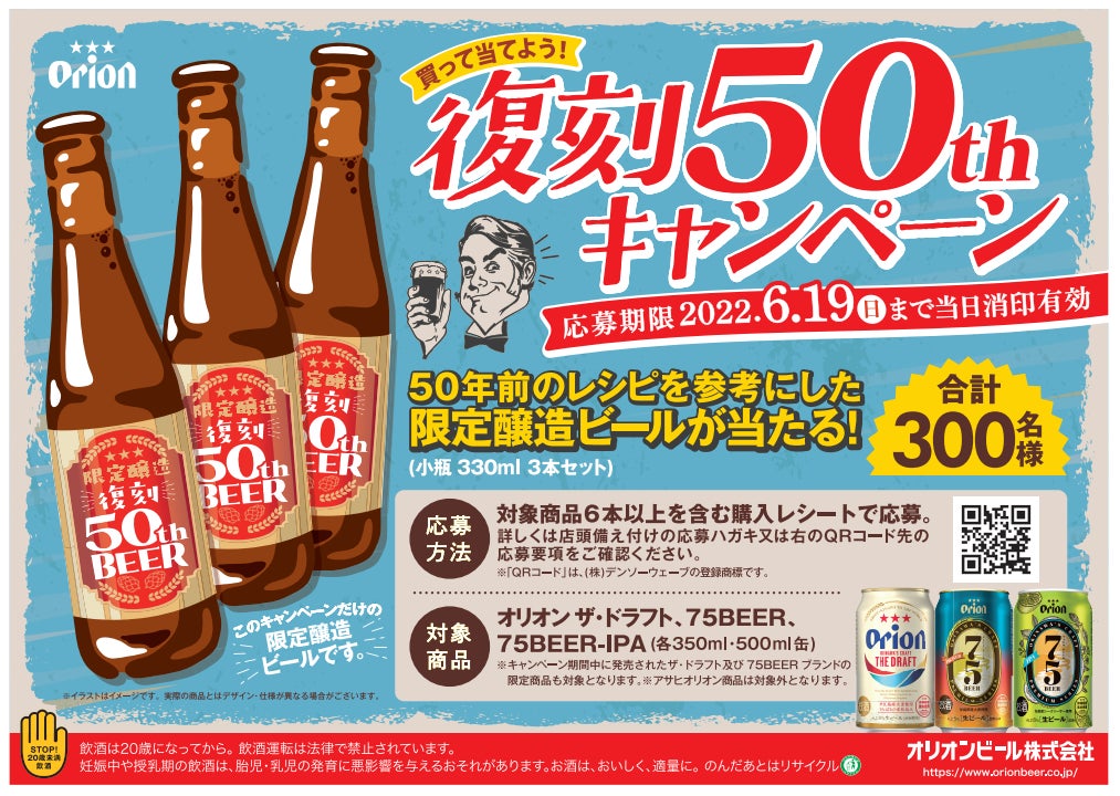 オリオンビール株式会社は、本年5月に沖縄復帰50周年を迎えることを記念し、「買って当てよう! 復刻50thキャンペーン」を実施します。本キャンペーンでしか手に入らない、50年前のレシピを参考にした限定醸造ビールが抽選で300名様に当たります!