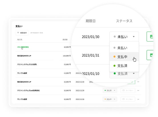 ・データ化された請求書の支払いステータスの一括管理が可能に。リマインドメールによって取引先への支払い漏れも防止。