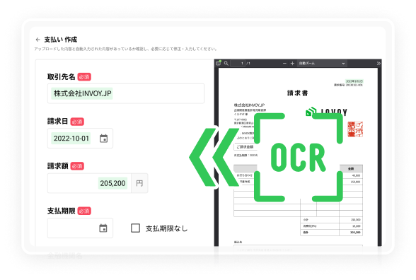 「INVOY」にアップロードした請求書の画像やPDFをOCRで読み取り、自動で請求額や振込口座、支払期限などの支払情報がデータ化されます。これにより、紙書類と電子ファイルの両方をクラウド保管できます。