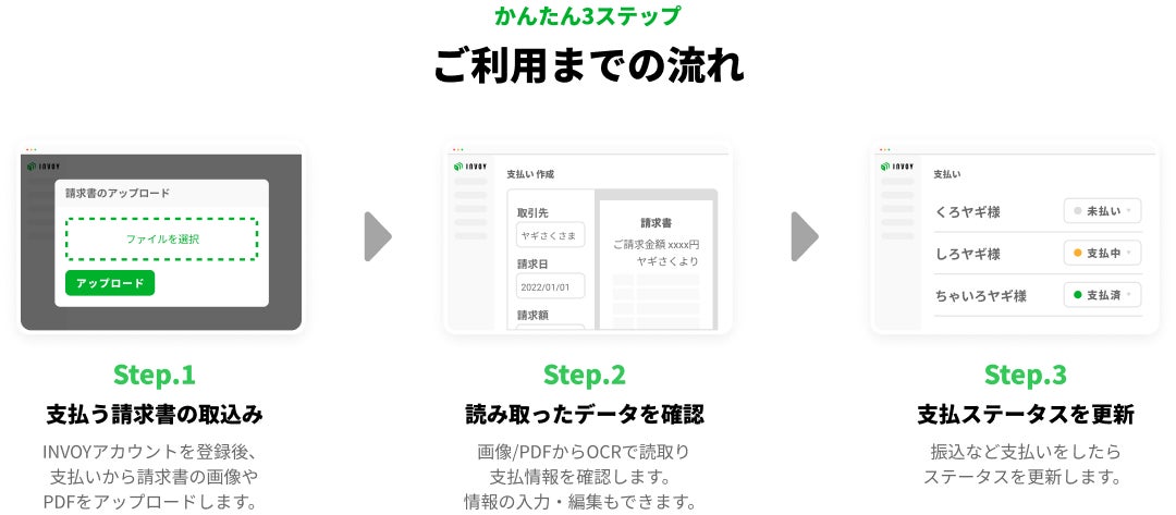 今回の請求書を自動データ化する機能の実装により、請求書の受取・データ化から支払い管理、さらに「INVOYカード払い」(https://corp.olta.co.jp/pr/2022-1007)を利用すれば支払いまで「INVOY」上でワンストップで処理することができます。なお、受取った請求書のデータ化を含む「INVOY」の基本機能は、請求書の枚数や利用メンバー数、取引先数などに制限なく、引き続き無料でご利用可能です。