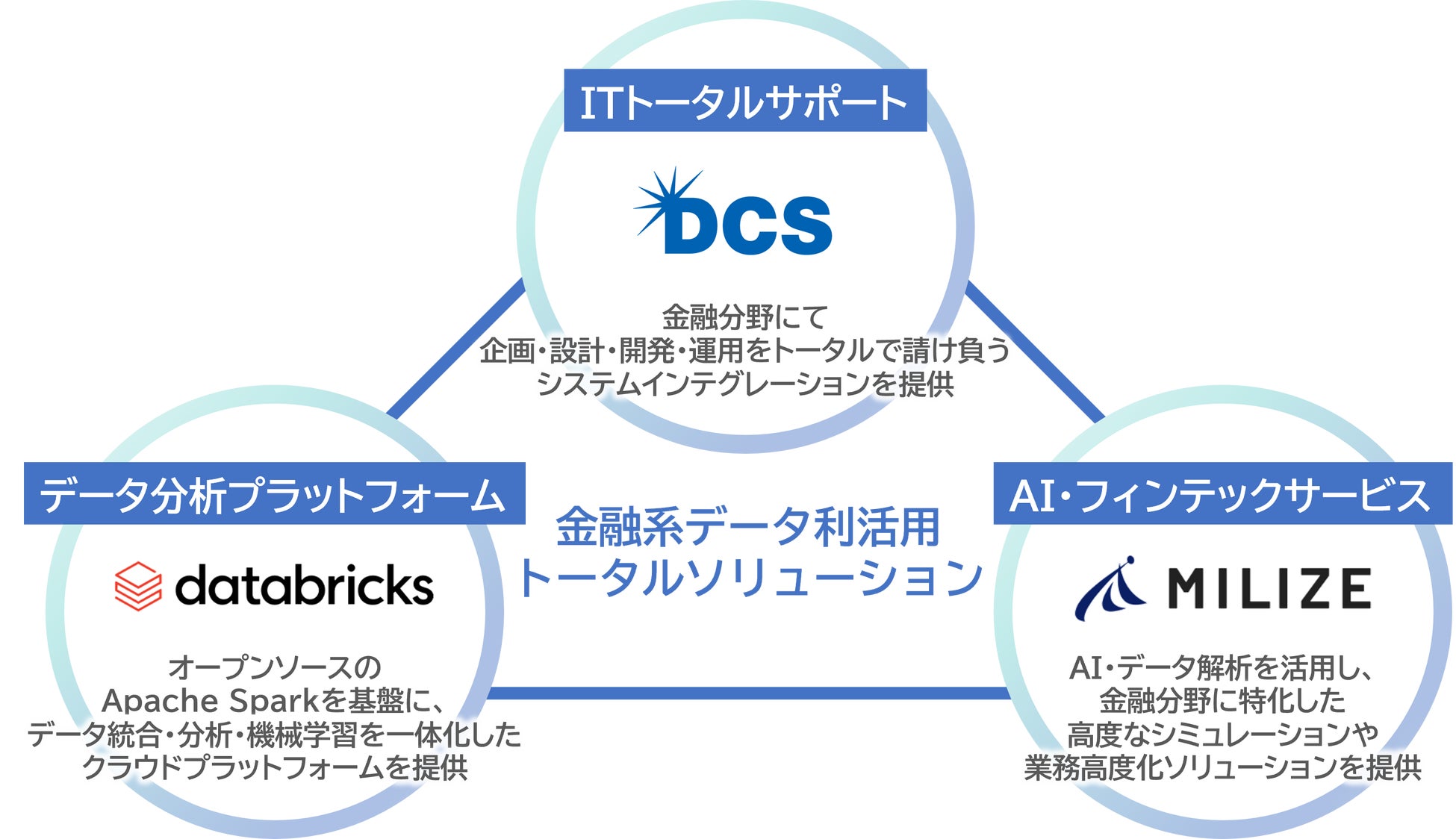 三菱総研DCS株式会社(本社:東京都品川区、代表取締役社長:亀田 浩樹、以下DCS)は金融業に特化したデータ利活用トータルソリューションの提供に向けて、2025年4月よりDatabricks(本社:米国カリフォルニア州サンフランシスコ、以下データブリックス)とSI・コンサルティングパートナー契約を、株式会社MILIZE(本社:東京都港区、代表取締役社長:田中 徹、以下MILIZE)と協業契約を締結しました。