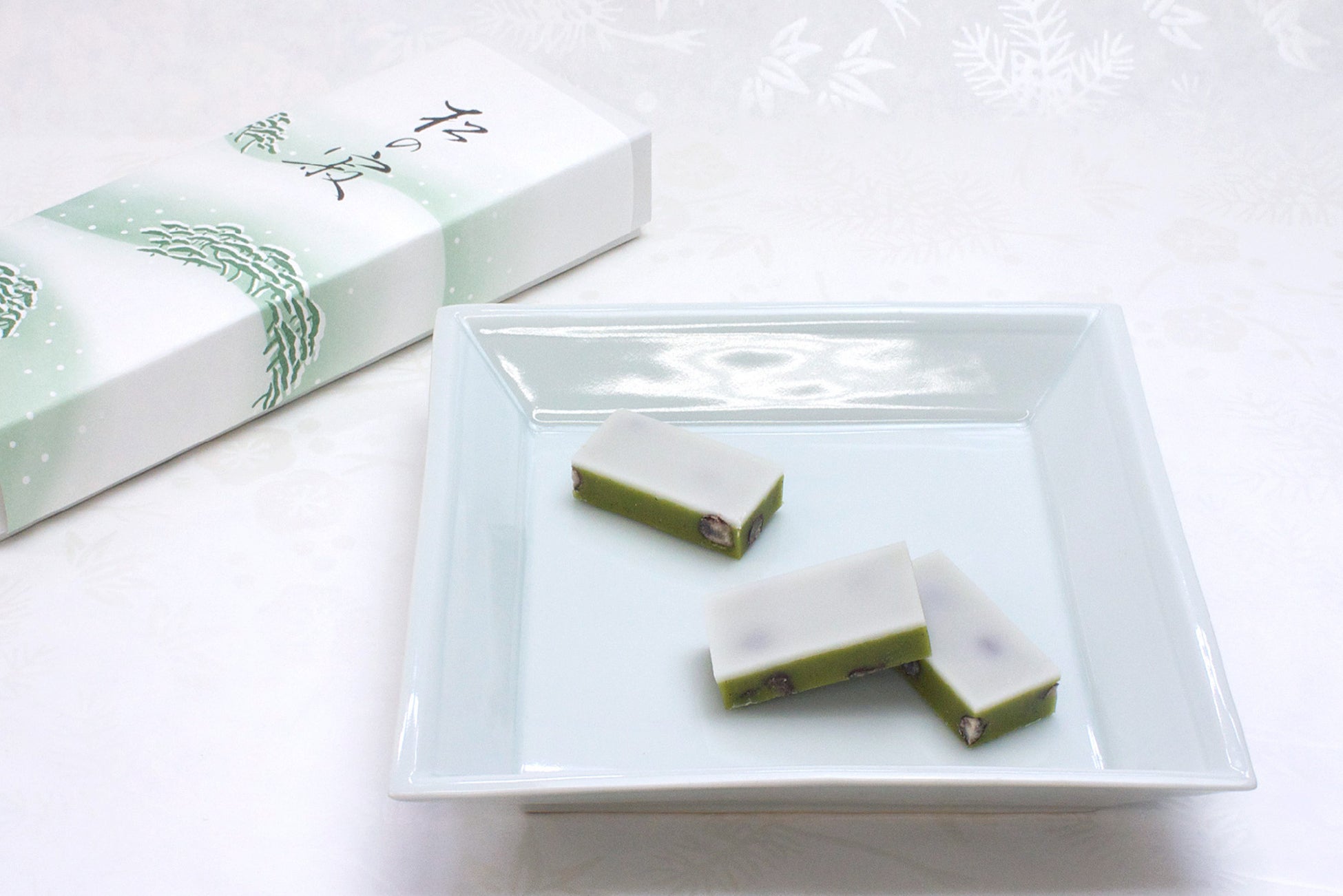 京都府産の宇治抹茶をこめたすり琥珀に丹波大納言小豆をちらして。まるで雪を踏みしめるかのような“しゃりっ”とした歯ざわりとやわらかい甘み、香り高い抹茶と小豆がしっとりと緑深い松を想わせる「松の寂」。