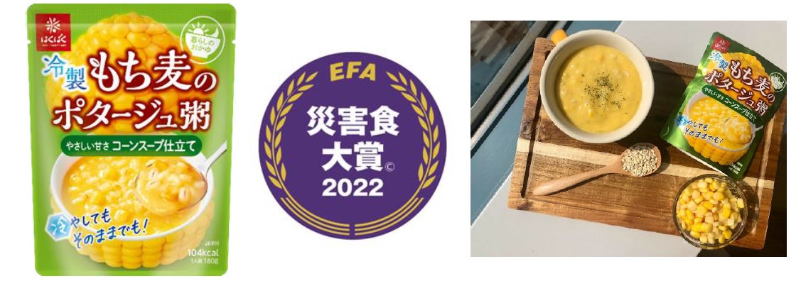 穀物のリーディングカンパニー株式会社はくばく(本社:山梨県中央市、代表取締役社長:長澤 重俊)は、一般社団法人防災安全協会が主催する「災害食大賞©2022」《ローリングストック部門》にて、『もち麦のポタージュ粥 コーンスープ仕立て』が“最優秀賞”を受賞いたしました。