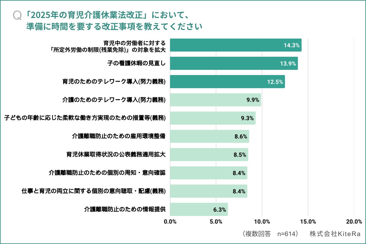 準備に時間を要する改正事項について聞いたところ、最も多かったのは「育児中の労働者に対する『所定外労働の制限(残業免除)』の対象拡大」で14.3%、次いで「子の看護休暇の見直し」が13.9%、さらに「育児のためのテレワーク導入(努力義務)」が12.5%という結果となりました。