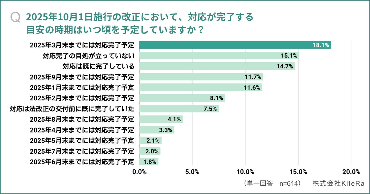 10月1日施行の改正において、対応完了の目安時期は「2025年3月末までには対応完了予定」が最多