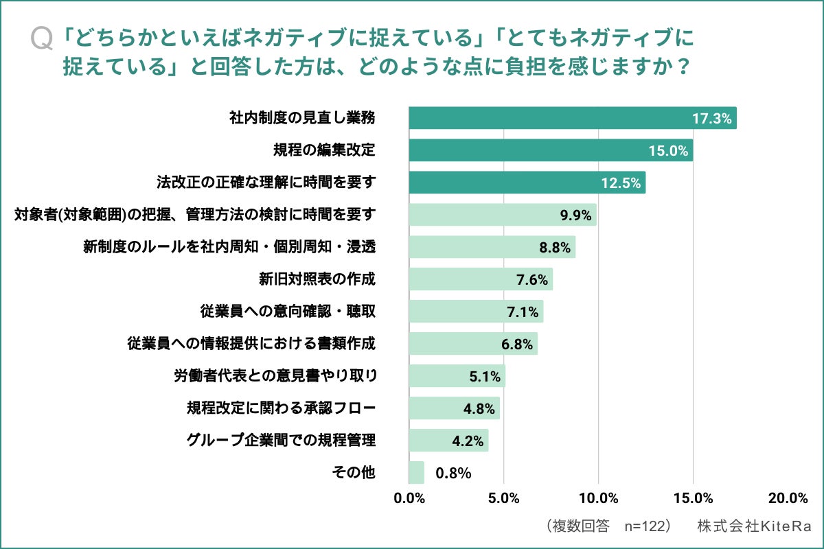 「どちらかといえばネガティブに捉えている」「とてもネガティブに捉えている」と回答した方を対象に、負担に感じている点について聞いたところ、最も多かったのは「社内制度の見直し業務」で17.3%、次いで「規程の編集改定」が15.0%、さらに「法改正の正確な理解に時間を要すること」が12.5%という結果となりました。