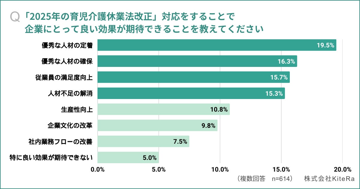 今回の調査では、2025年の育児・介護休業法改正が企業にとって「優秀な人材の定着」「優秀な人材の確保」「従業員の満足度向上」「人材不足の解消」につながると期待されていることが明らかになりました。