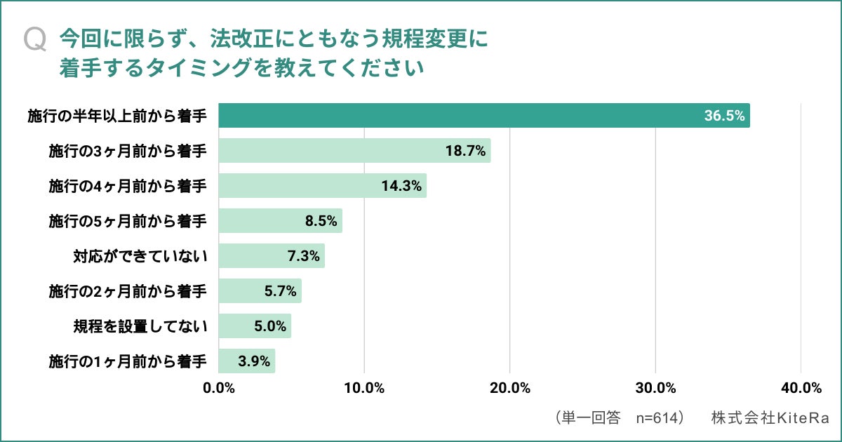 36.5%が法改正にともなう規程変更に「施行の半年以上前から着手」している
