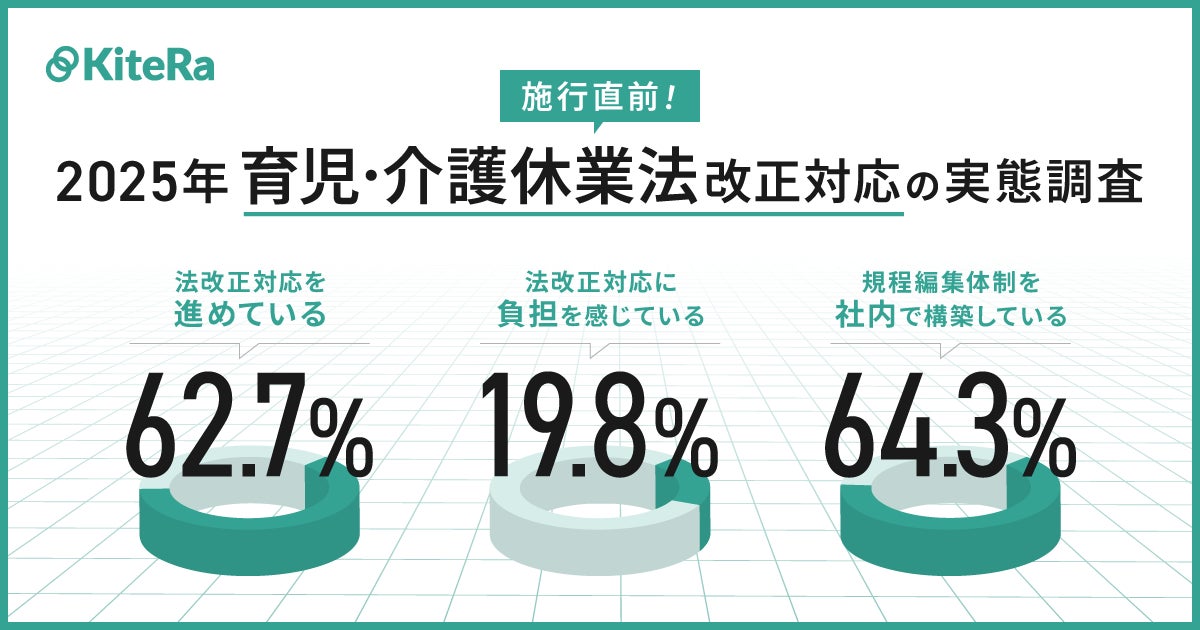 社内規程DXサービス「KiteRa Biz(キテラビズ)」と、社労士向けサービス「KiteRa Pro(キテラプロ)」を展開する株式会社KiteRa(代表取締役社長CEO:植松隆史、本社:東京都港区、読み:キテラ、以下「当社」)は、2025年の育児・介護休業法改正にともない業務対応が求められる規程業務担当者614名を対象に、『2025年 育児・介護休業法改正対応の実態調査』を行いました。