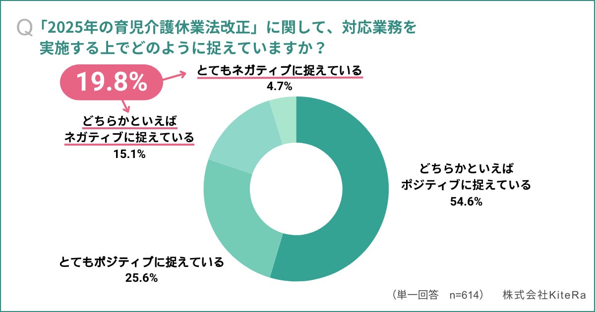 「2025年の育児・介護休業法改正」に関して、対応業務を実施する上でどのように捉えているのかを質問したところ、「どちらかといえばネガティブに捉えている」が15.1%、「とてもネガティブに捉えている」が4.7%で、約2割(19.8%)が今回の法改正対応に対してネガティブな印象を持っていることが分かりました。