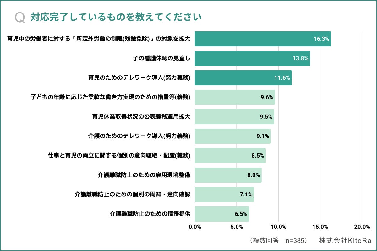 Q1で「対応を進めている」と回答した方を対象に、対応完了しているものを聞いたところ、最も多かったのは「育児中の労働者に対する『所定外労働の制限(残業免除)』の対象を拡大」が16.3%でした。次いで「子の看護休暇の見直し」が13.8%、「育児のためのテレワーク導入(努力義務)」が11.6%という結果となりました。