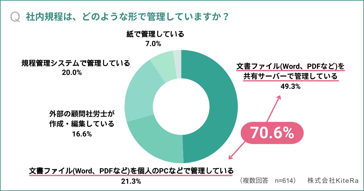 さらに、今回の新法対応における「育児・介護休業規程」「労使協定書」の編集体制を社内で構築している企業は64.3%にのぼる一方で、社内規程の管理方法については「文書ファイル(Word、PDFなど)を共有サーバー/個人のPCなどで管理している」と回答した企業が70.6%に達していることも明らかになりました。
