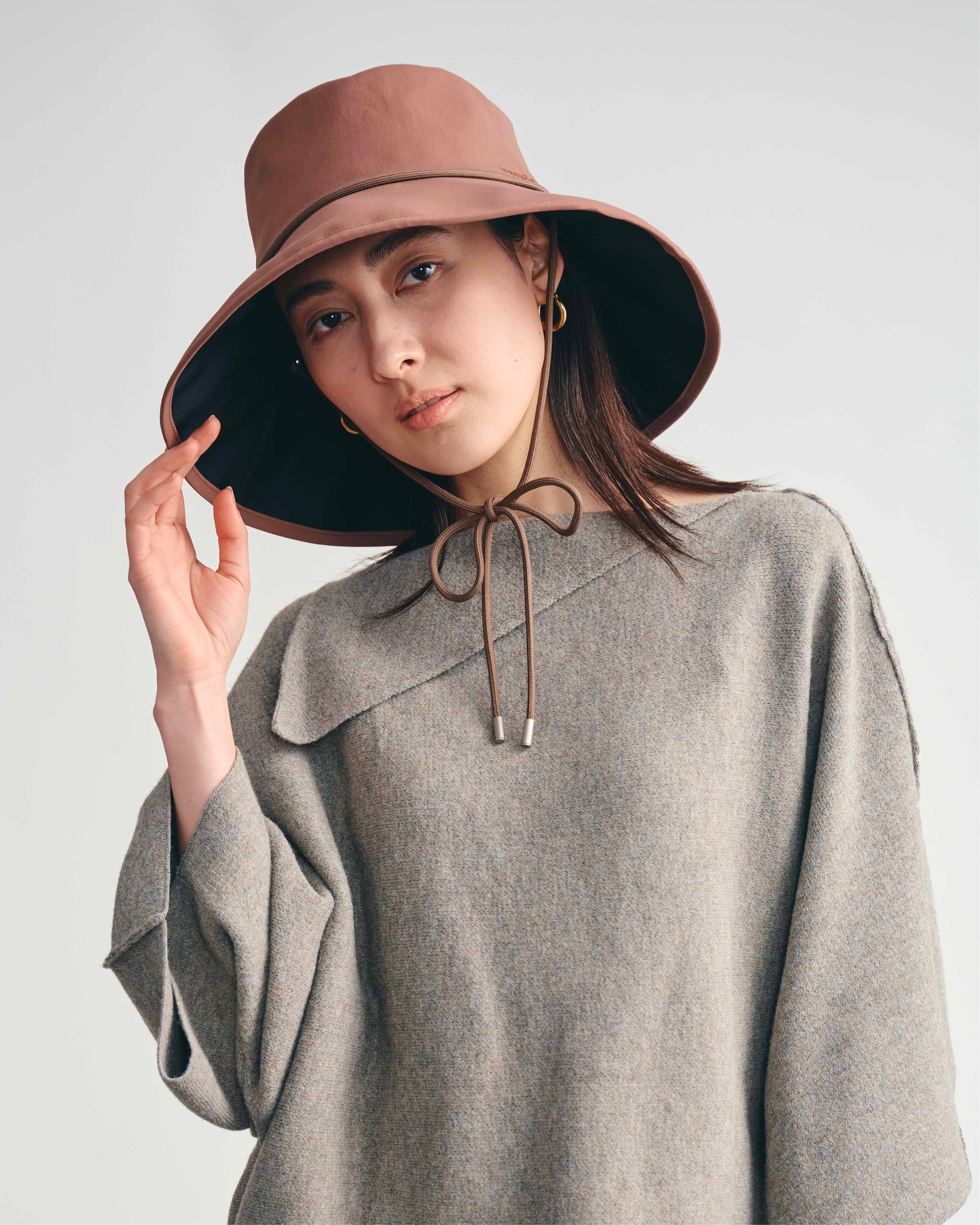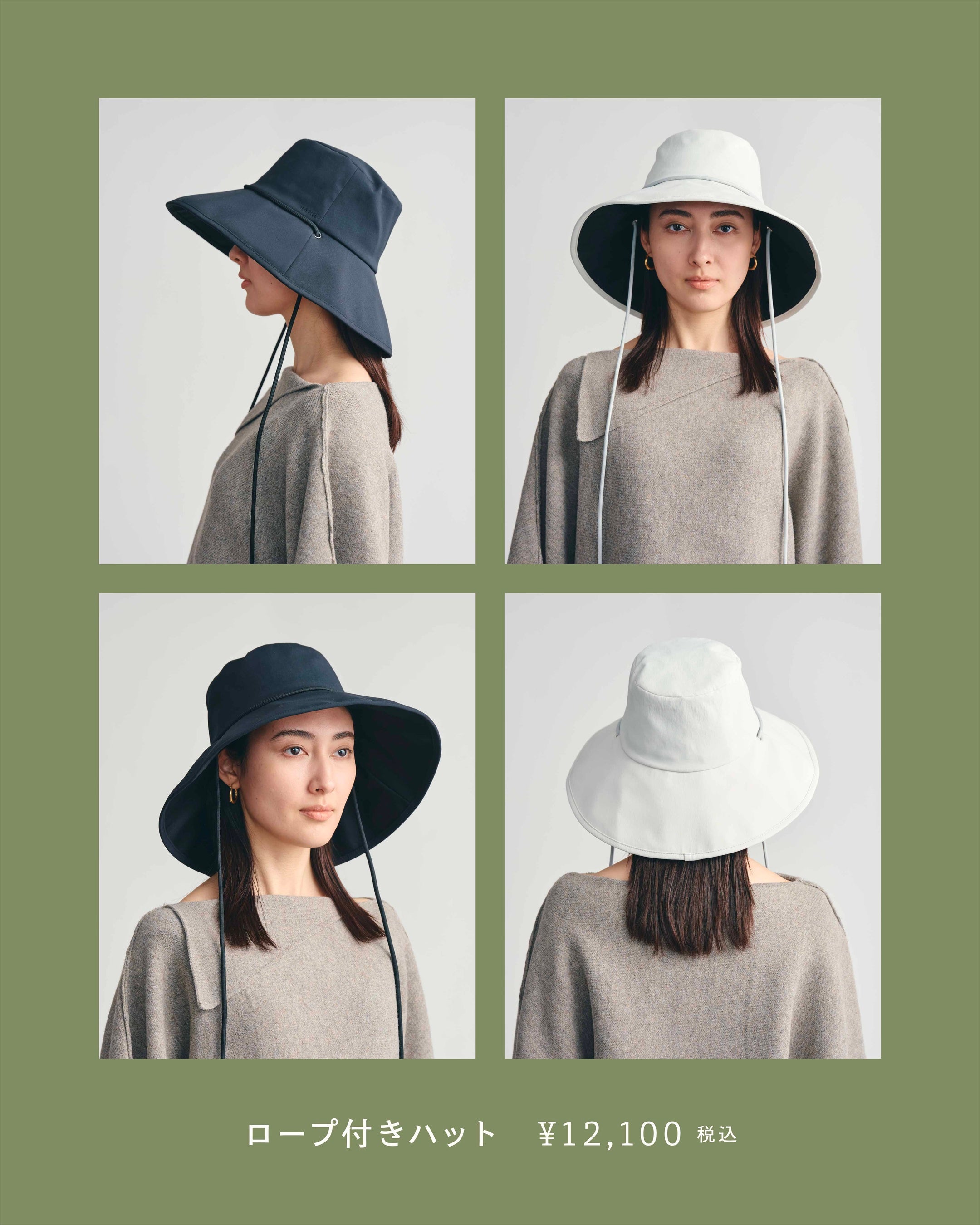 角度のついたブリムが自然な影をつくり、フェイスラインをすっきりと整える設計。取り外し可能なロープが装いのアクセントになるとともに、着用時の安定感も高めます。ニュアンスカラー3色展開。