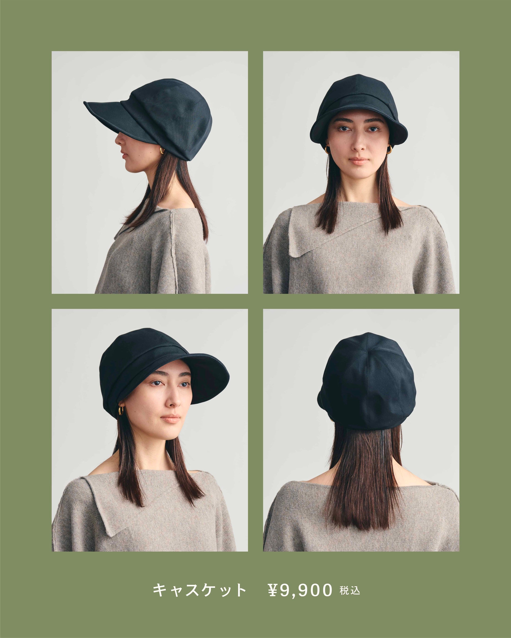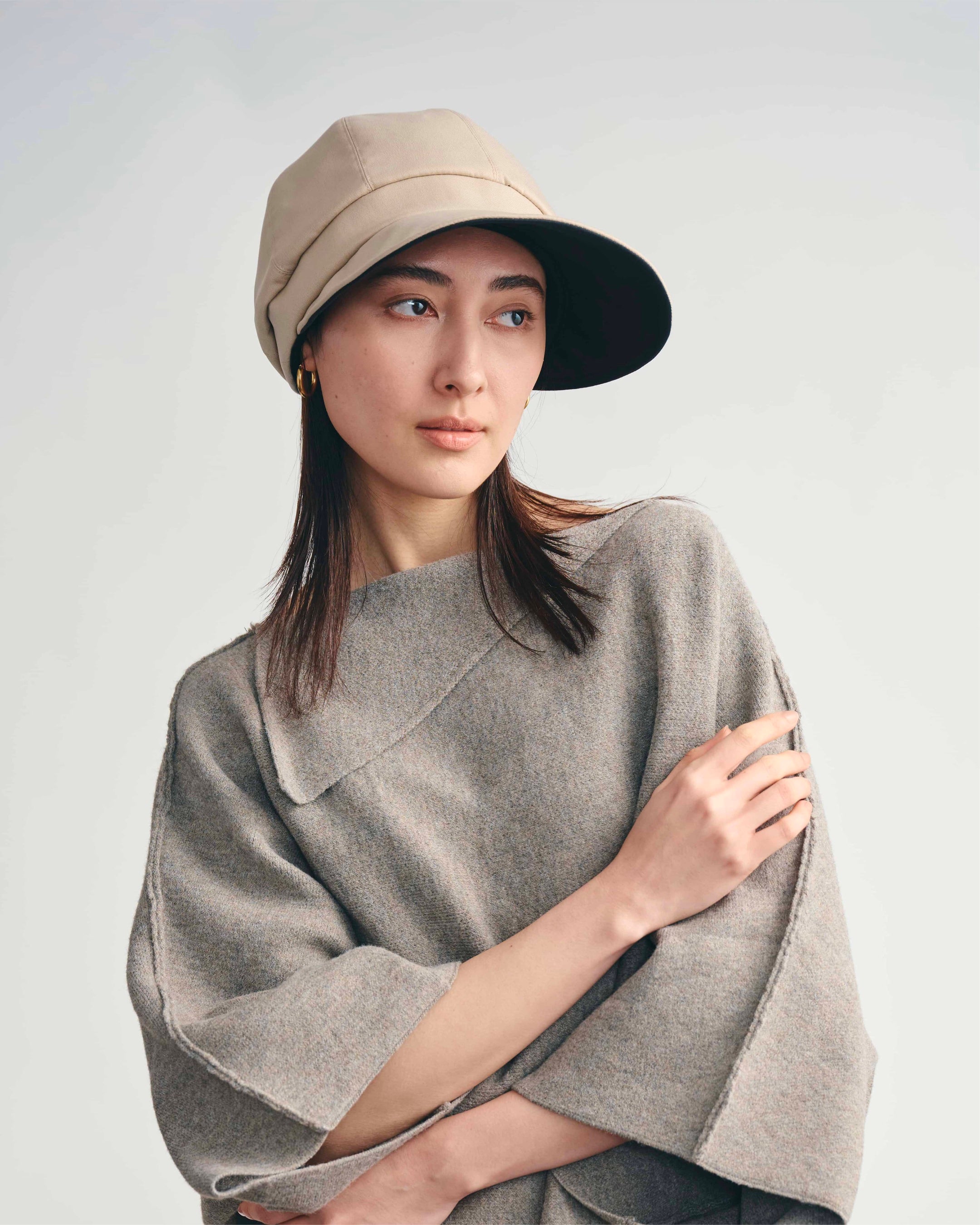 深め設計で額から目元まで自然な影をつくる、端正なキャスケット。丸みのあるフォルムがカジュアルにもきれいめにも馴染むバランスで、日差し対策を前提に考えたシルエットです。