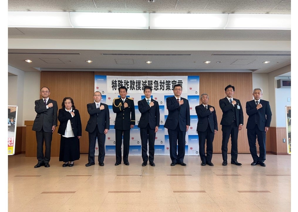 広島県警察本部で特殊詐欺撲滅緊急対策宣言が行われ、広島県知事の湯﨑英彦氏をはじめ、広島県内の金融機関や、防犯連合会などの代表者らが出席しました。そのなかで杉対策監は「広島県警察は特殊詐欺を撲滅しようと対策に力を注いでいるため、我々も企業などに対して、特殊詐欺の対策をするようお願いするなど、対策を進めている。特殊詐欺は現在、多様で巧妙な手口が多く、高齢社会で高齢者が増えていることもあって特殊詐欺認知件数が増加している。特に最近では還付金詐欺の被害が多く、還付金がもらえるからと聞いてATMに行って詐欺に遭ってしまう。対策としてATMでは携帯電話を使用しないよう呼びかけているにも関わらず、携帯電話をATMで使用している人がいる。そのような人がいたら声をかけて一旦止めてあげてほしい。防犯カメラの設置や「ストップ!ATMでの携帯電話」運動などの対策を進めることで、特殊詐欺を撲滅できる可能性がある。SOS47のメンバーも、一人ひとりが特殊詐欺を撲滅する意識を持って、より一層啓発活動を強めていきたい。」と高齢社会での特殊詐欺撲滅に向けた今後の対策について述べました。そして最後に、湯﨑知事らとともに特殊詐欺撲滅へ向けての決意を確認し合いました。