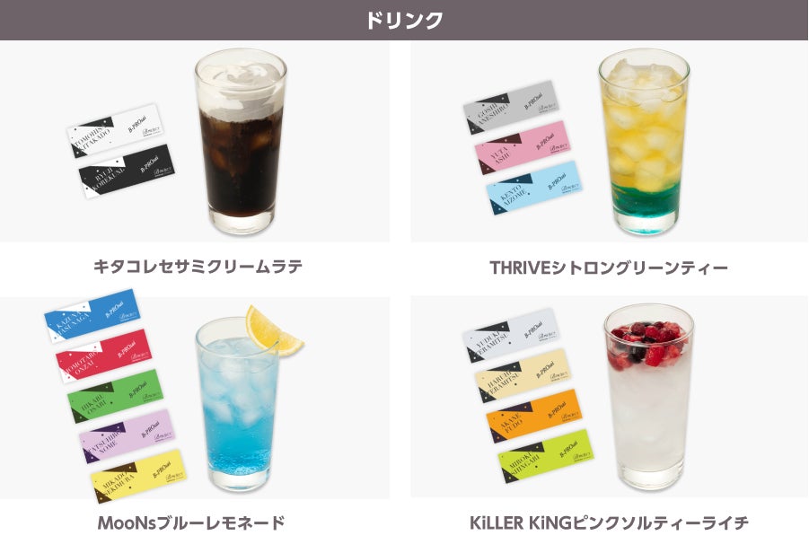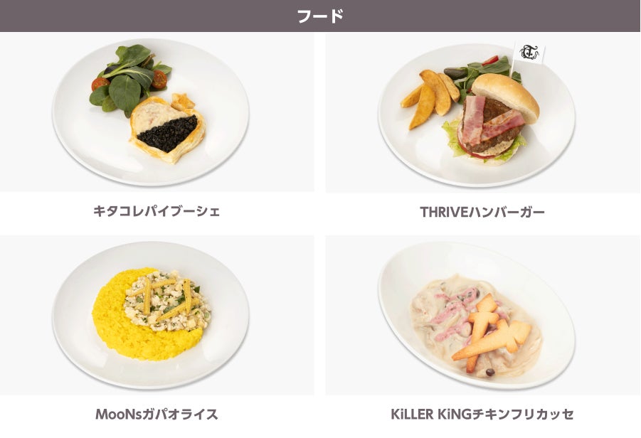 コラボカフェ史上最高クオリティの美味しさに挑戦し続けるCookpadTVが、「料理はもっと楽しくて、もっと自由だ」という想いを込めて、B-PROJECTの「キタコレ」、「THRIVE(スライブ)」「MooNs(ムーンズ)」、「KiLLER KiNG(キラーキング)」4組のグループロゴや衣装を再現したコラボメニューを考案しました。