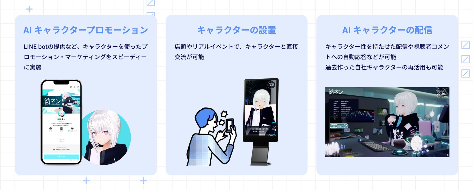 創業以来のVTuber関連事業と最新のAI技術を活用したAIキャラクター事業、自社開発のIP事業を世界に向けて発信していきます。