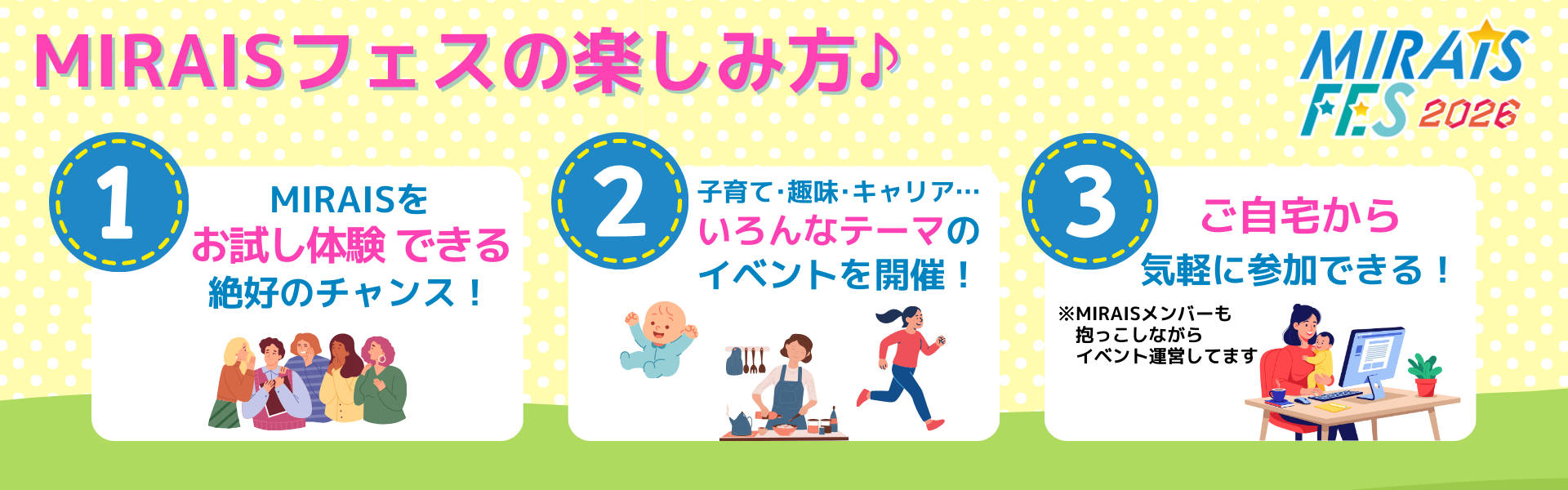 今回で 3回目 となるMIRAISフェスは、メンバーの日々の「小さな気づき」や「宝物のような発見」を共有し、子育てとキャリアの未来の可能性を広げる8日間のオンラインイベントです。