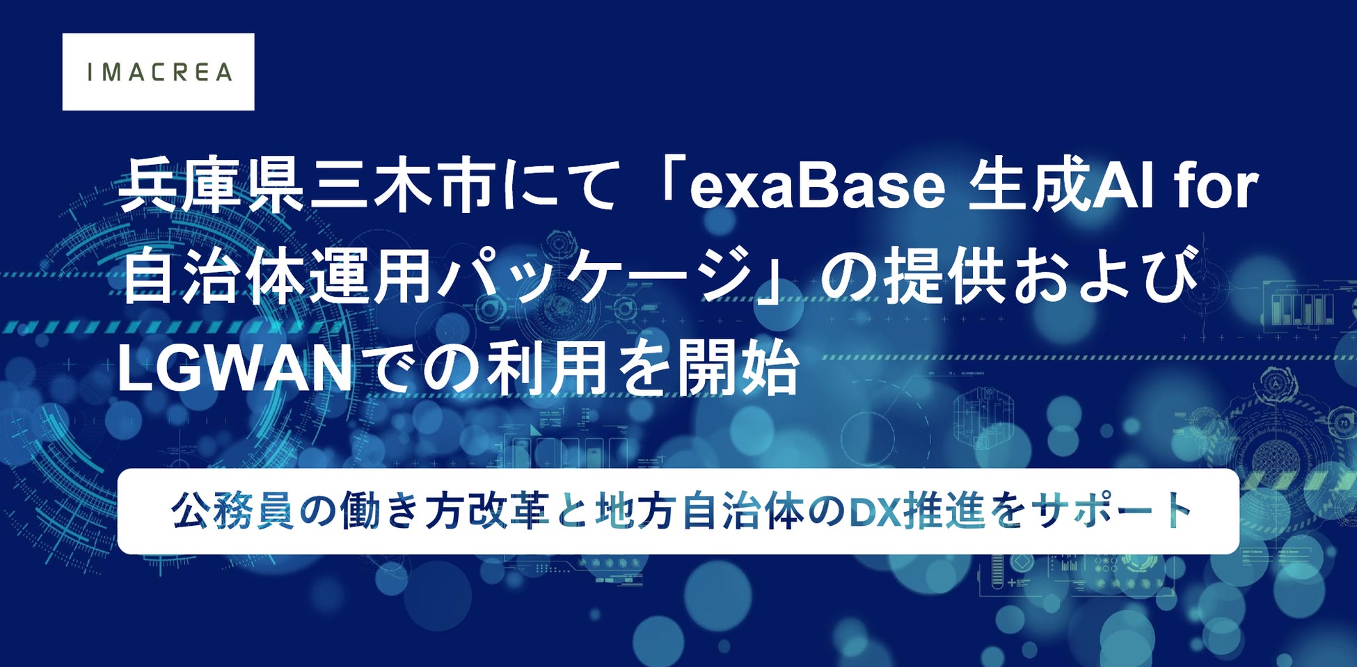 株式会社イマクリエ(本社:東京都港区、代表取締役:鈴⽊信吾、以下、当社)は、兵庫県三木市に「exaBase 生成AI for 自治体運用パッケージ」の提供を開始したことをお知らせします。