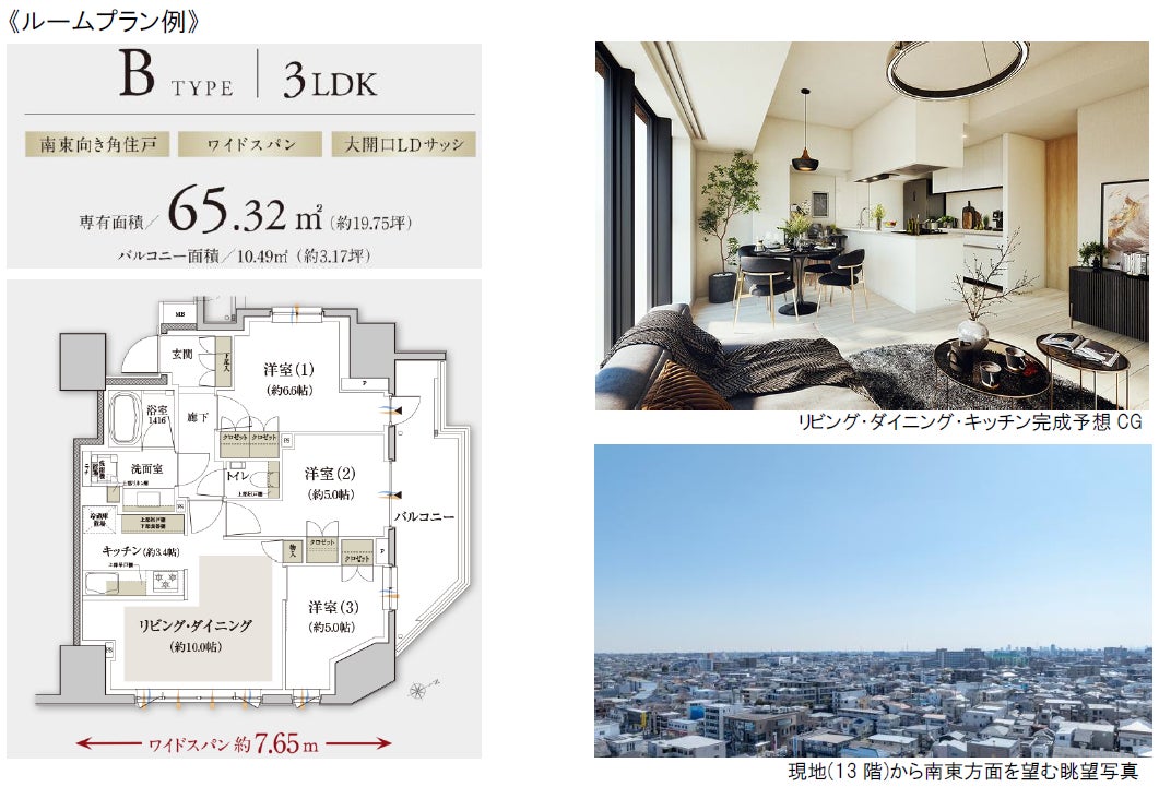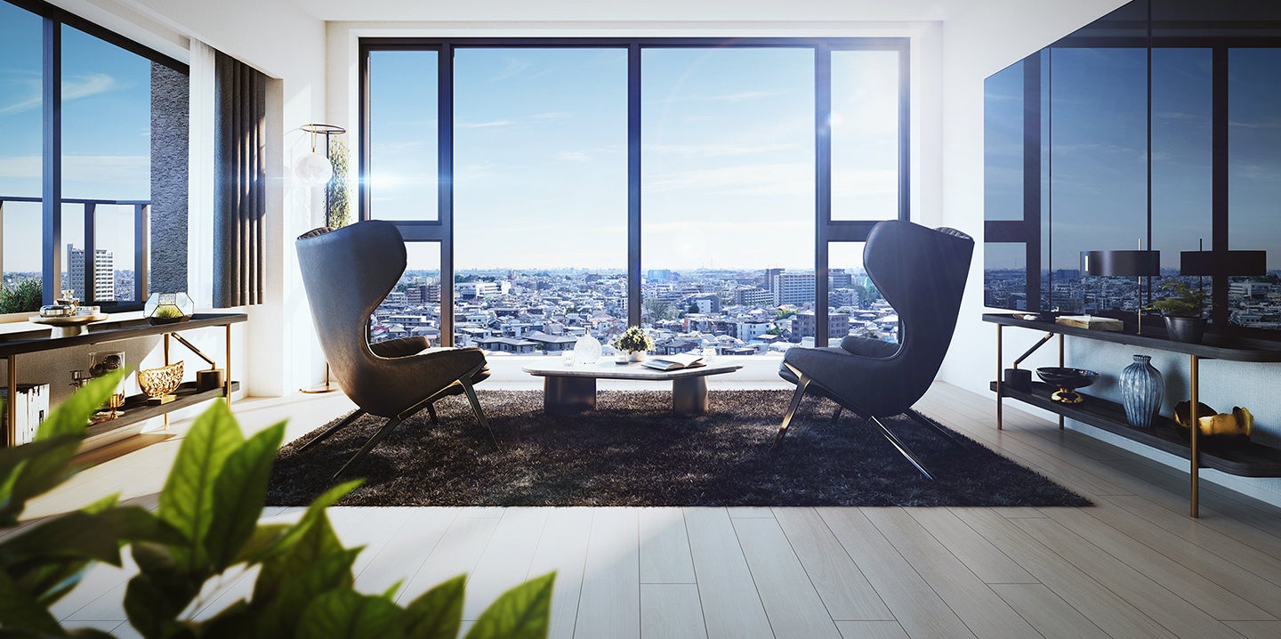 ※掲載の外観完成予想CGは、計画段階の図面を基に描き起こした外観と現地より撮影した東方面の眺望(13階相当/2024年3月撮影)を合成加工したもので実際とは異なります。※各完成予想CGの形状・色彩・外構・植栽等は実際とは異なります。形状の細部・設備機器・配管等は省略または簡略化の上、表現しております。今後、行政指導・施工上の理由等により、計画に変更が生じる場合があります。家具・調度品・オプション等は販売価格に含まれておりません。また、各完成予想CGの眺望は階数や部屋によって異なります。眺望は周辺環境の変化などによって変わる場合があり、将来的に眺めを保証するものではございません。