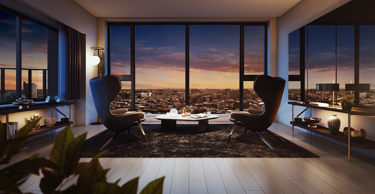 最上階は、1フロアに1邸のみのペントハウス仕様としました。高さ約2.35mのハイサッシと約14mのワイドスパンを掛け合わせ、窓辺の開放感を一層高めます。また、特別な開放感や眺望を心行くまで楽しむことができるよう10m2超のルーフバルコニーも備えました。