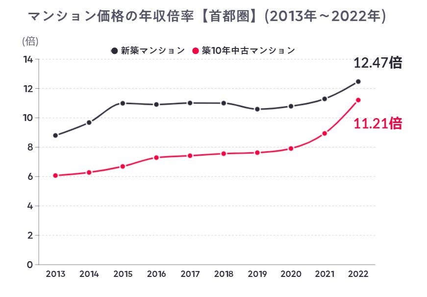 近年の建築労務費・建築資材の原価高騰などを受けて新築分譲マンションの供給減少や価格高騰が続く中、新築・中古マンション購入の年収倍率は首都圏で11~12倍、近畿圏でも8~10倍と10年前と比べて+3~5ポイント高くなり、生活者にとってより高い買い物になってきています。